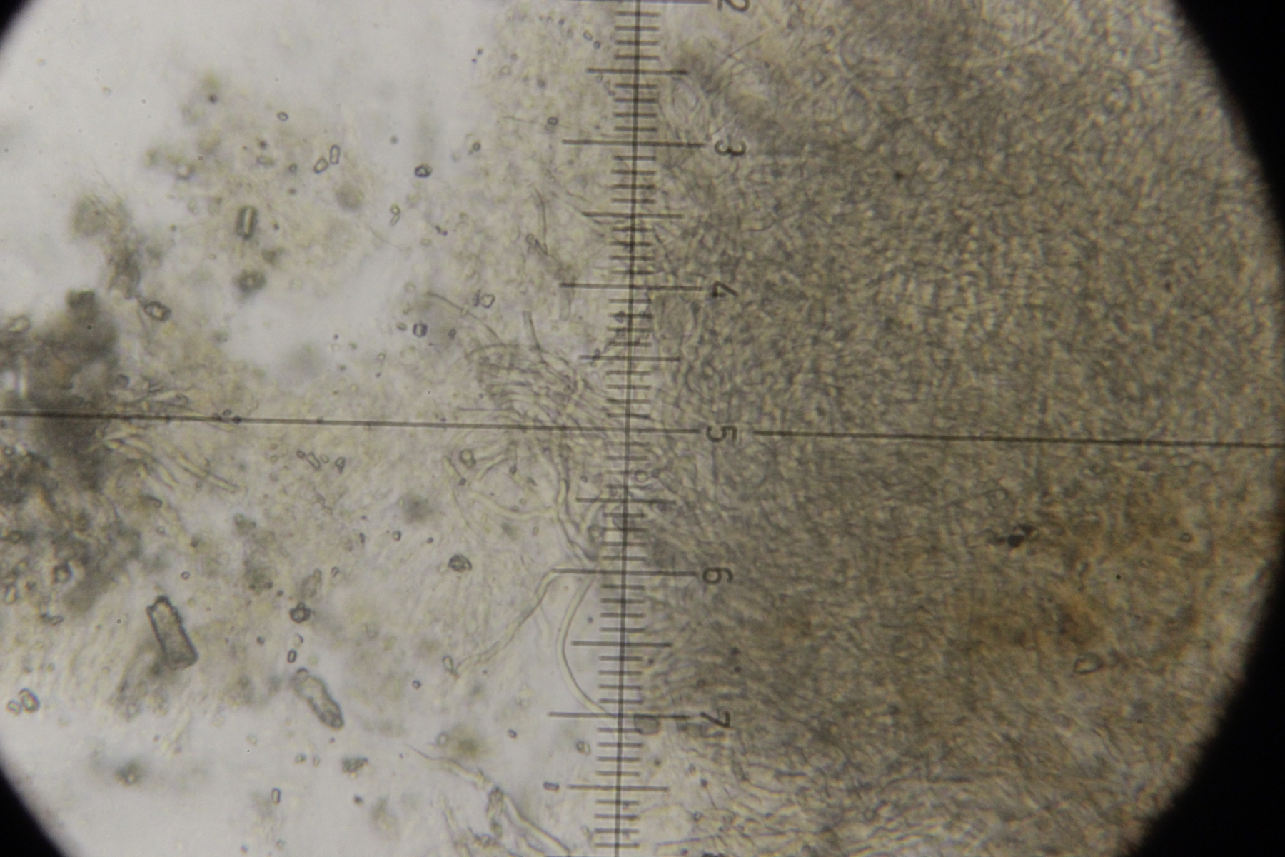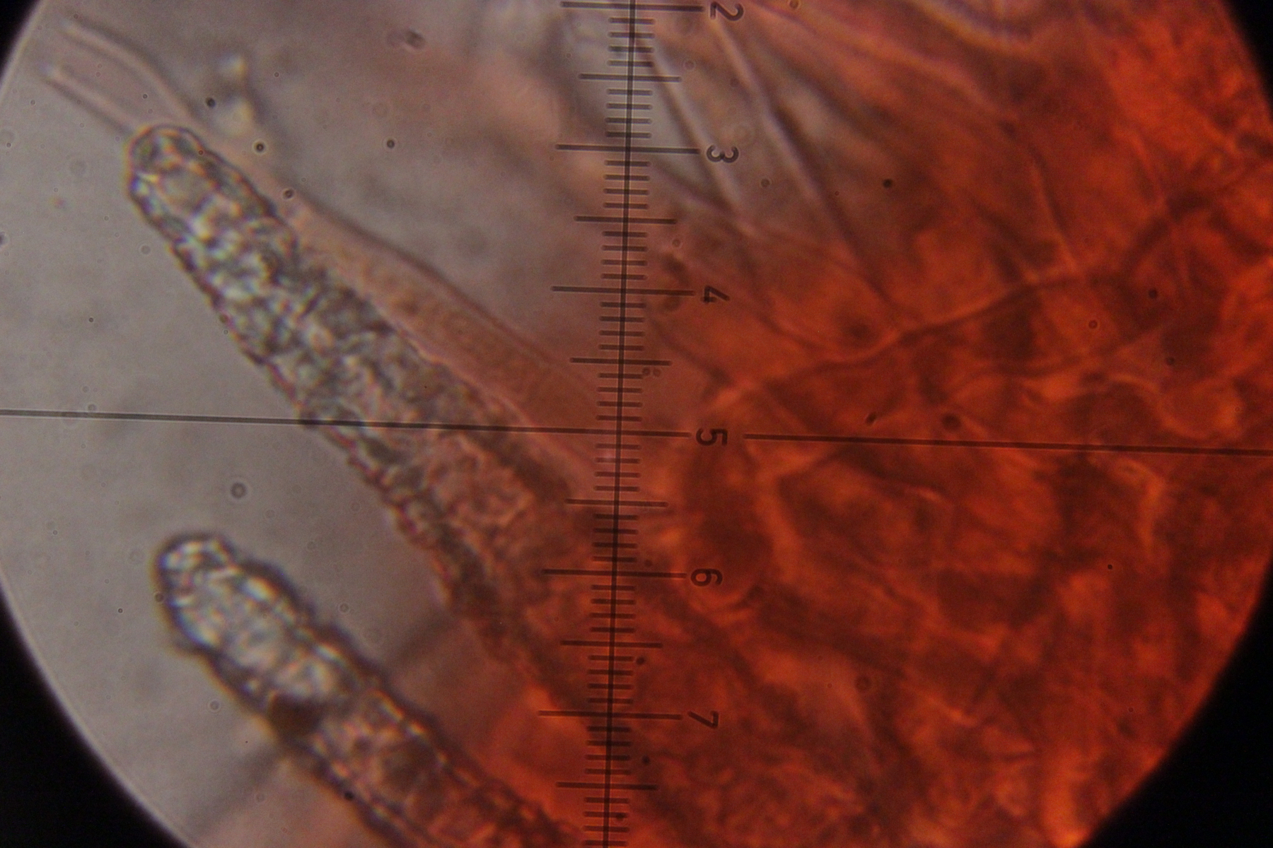 1. Unbekannter Pilz auf Buche. Auffällig sind die kristallbesetzen Zystiden, die reichlich vorhanden sind. Schnallen sind an einigen Septen vorhanden, die meisten Septen scheinen aber schnallenlos zu sein. Das gilt insbesondere für die Septen am Fuß der Zystiden. Sporen habe ich leider keine gefunden. Geht das wieder Richtung Phaenerochaete?
