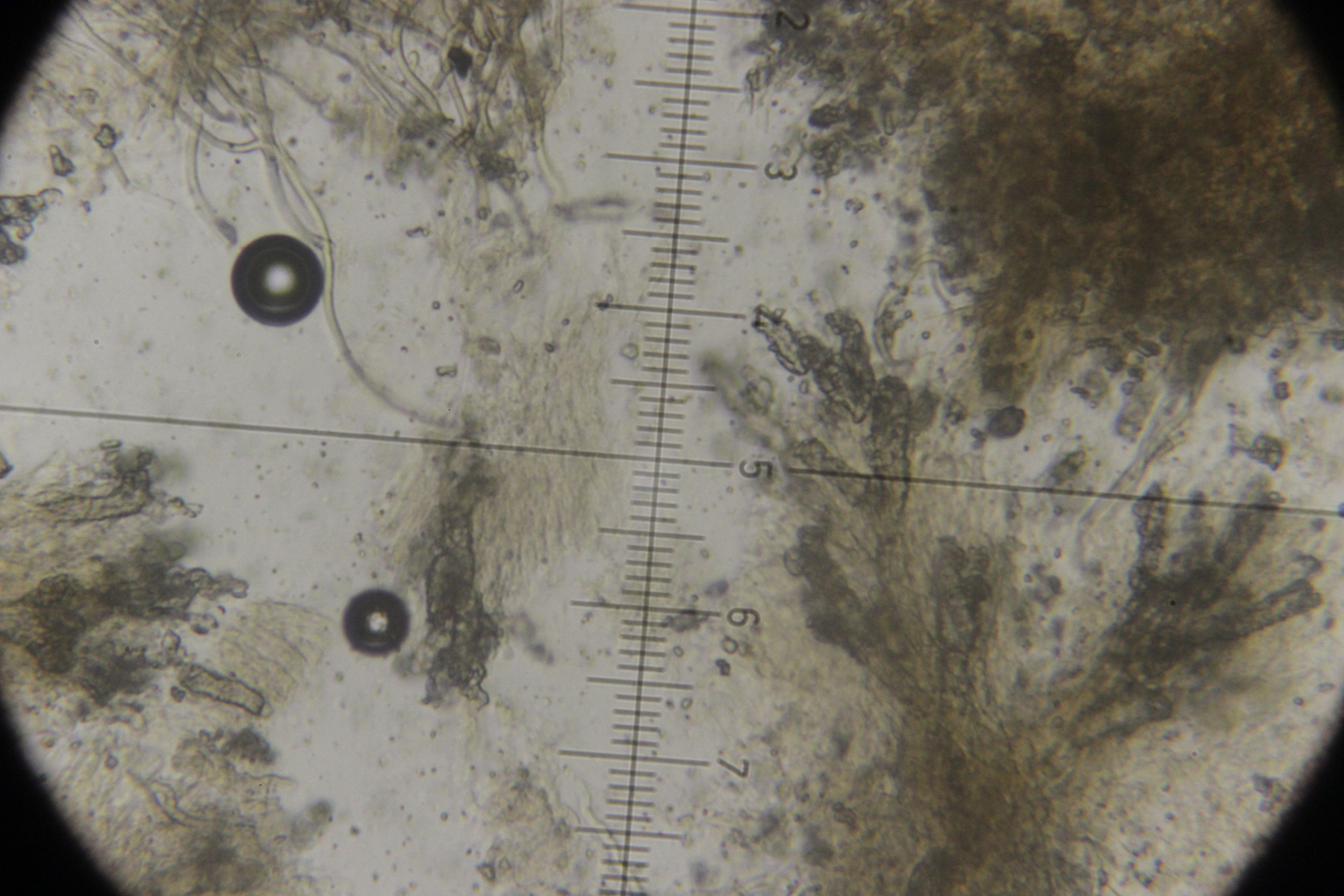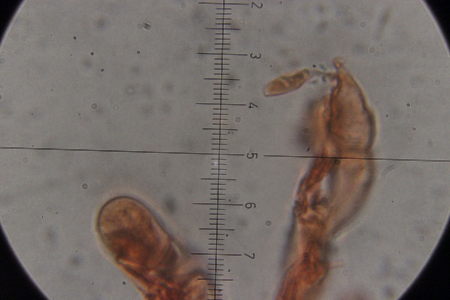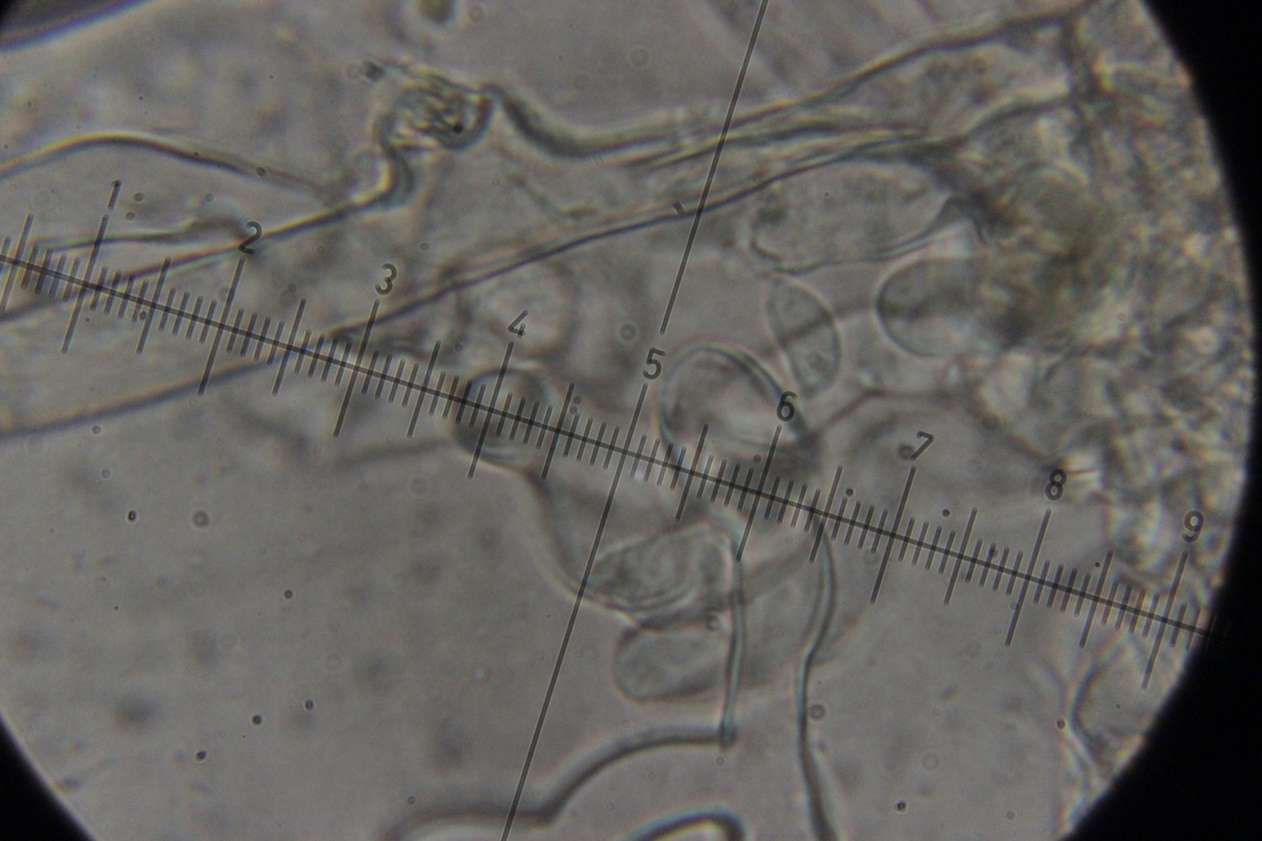 7. Botryobasidium vagum. Die einzige Basidie, die ich gefunden habe und die halbwegs gut zu beobachten war, hatte zwar nur 3 statt 6-8 Sterigmen, aber die Anordnung sah schon so aus, als wenn da einfach die Hälfte fehlt.
