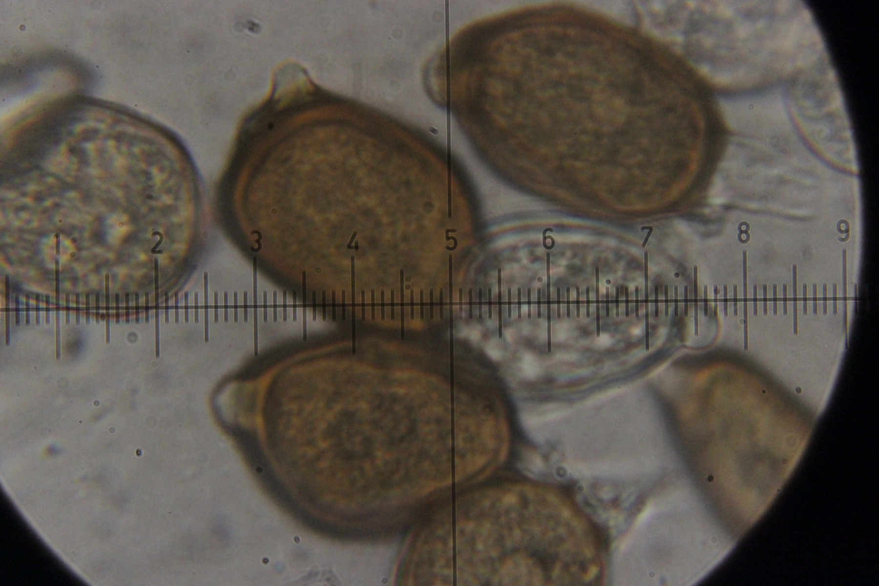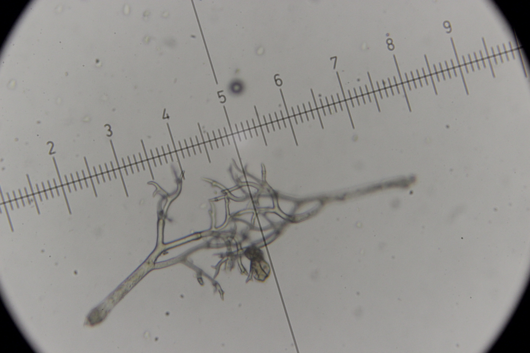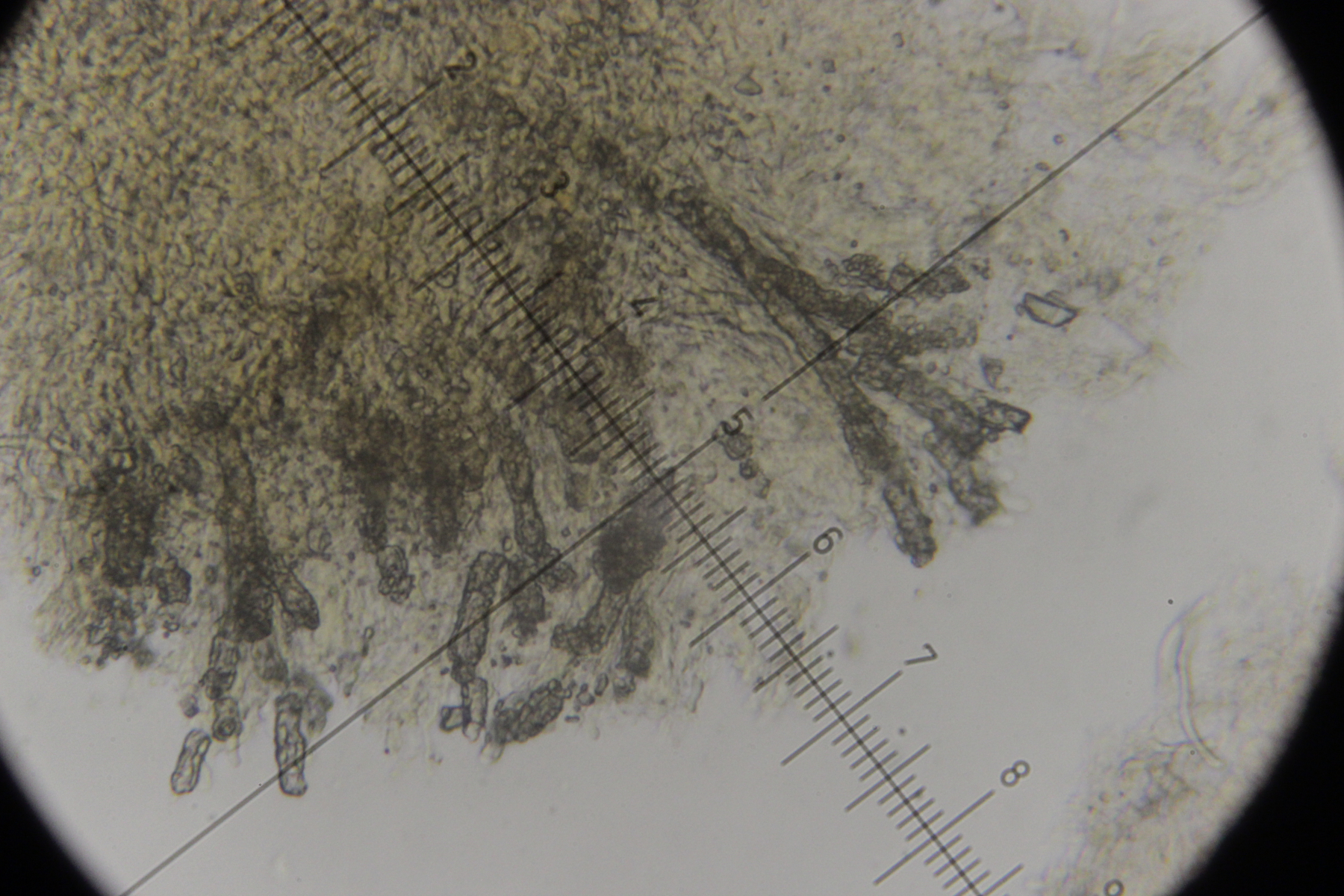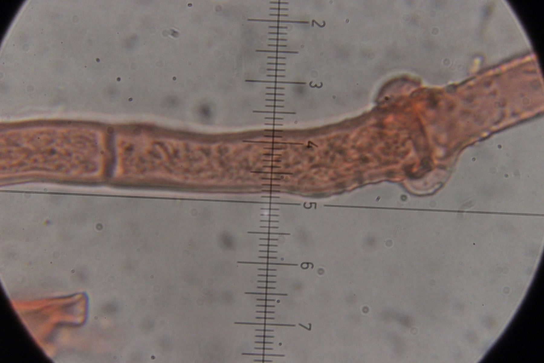 7. Botryobasidium vagum. Die einzige Basidie, die ich gefunden habe und die halbwegs gut zu beobachten war, hatte zwar nur 3 statt 6-8 Sterigmen, aber die Anordnung sah schon so aus, als wenn da einfach die Hälfte fehlt.