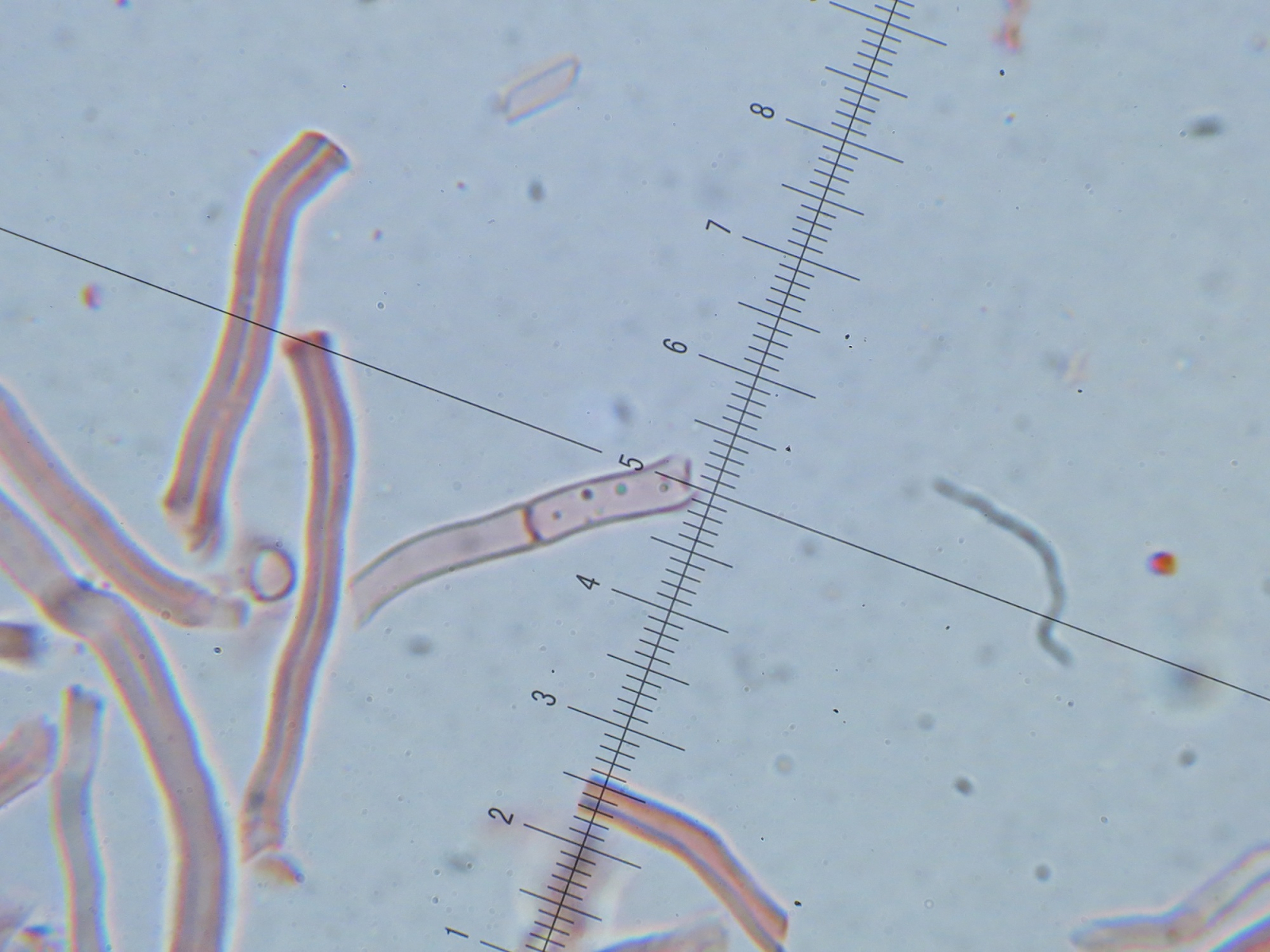 Für die Interpretation des Hyphensystems fehlt es mir an Erfahrung; aber die Septen haben nach m.E. keine Schnallen und Cystiden habe ich keine gefunden:
