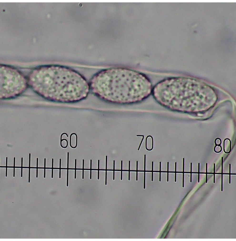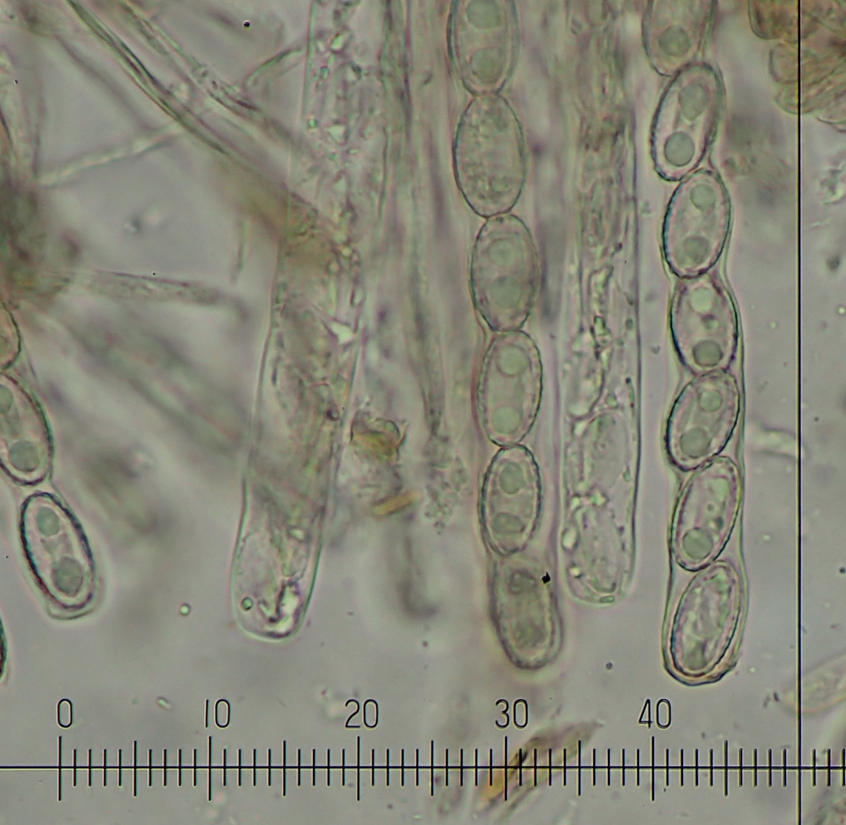 Die Sporen sind elliptisch ca.14-16 x 8-10 (leider tot, viele kollabiert, keine frei außerhalb der Asci), und mäßig feinwarzig mit 2 Tropfen.