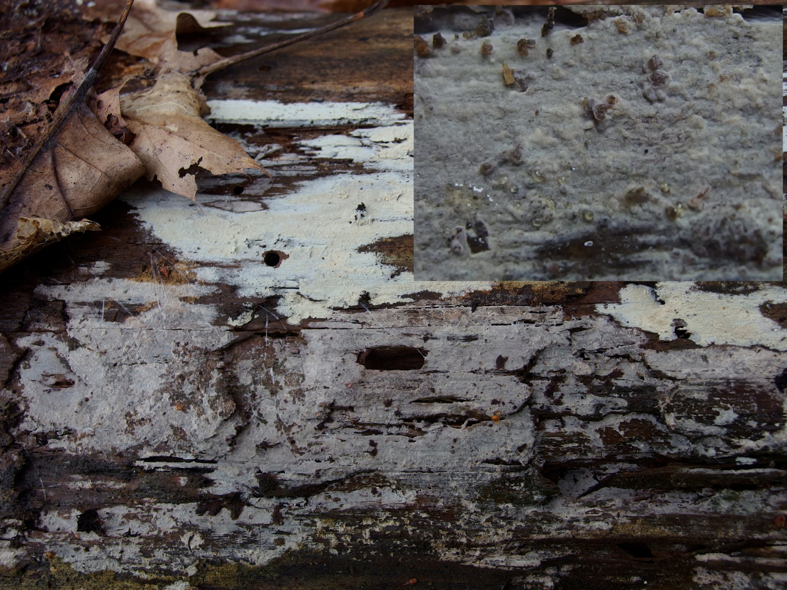 Der Pilz bildet ein sehr dünner Belag, in frischen zustand war es gräulich jetzt wo es trocken ist mehr gelblich, In Verbindung mit KOH kann man ein leichtes röten wahr nehmen.