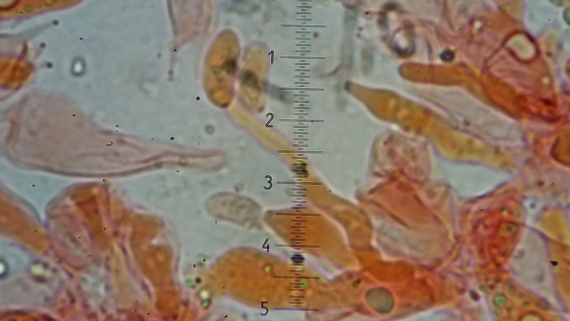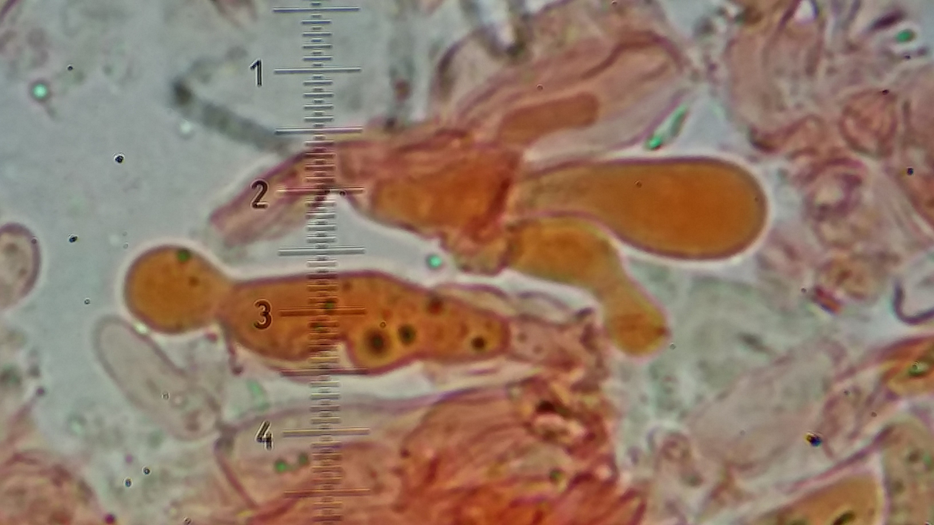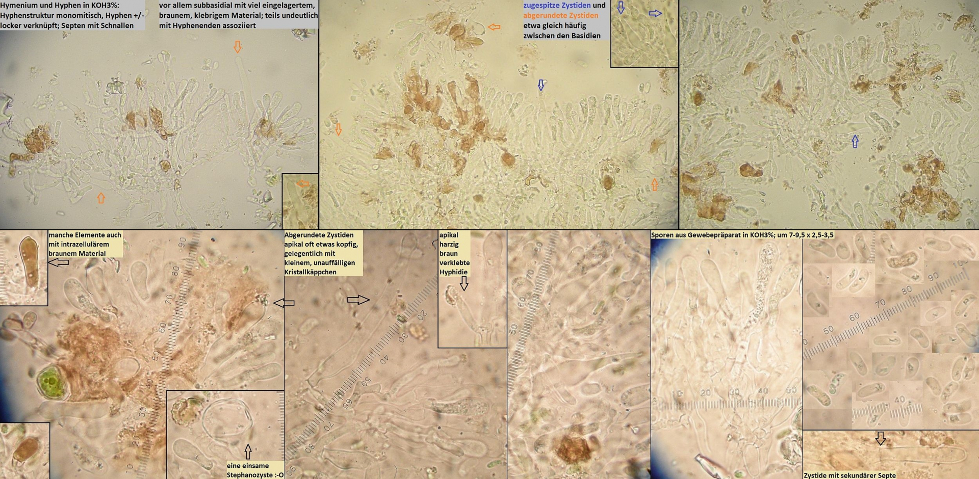 Unten links dürften Zystiden sein, apikal sind die mit etwas bedeckt, könnte Harz sein konnte aber auch was anderes sein, hier alles in KOH 3%