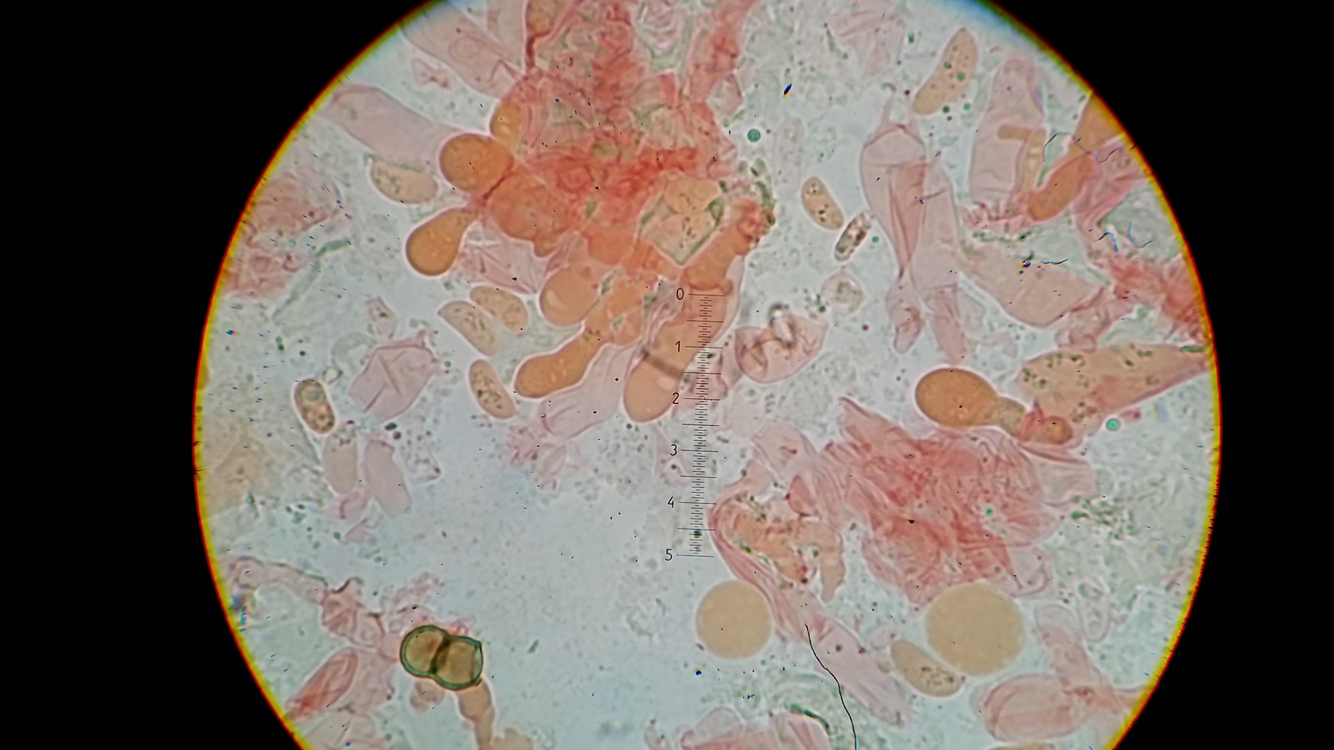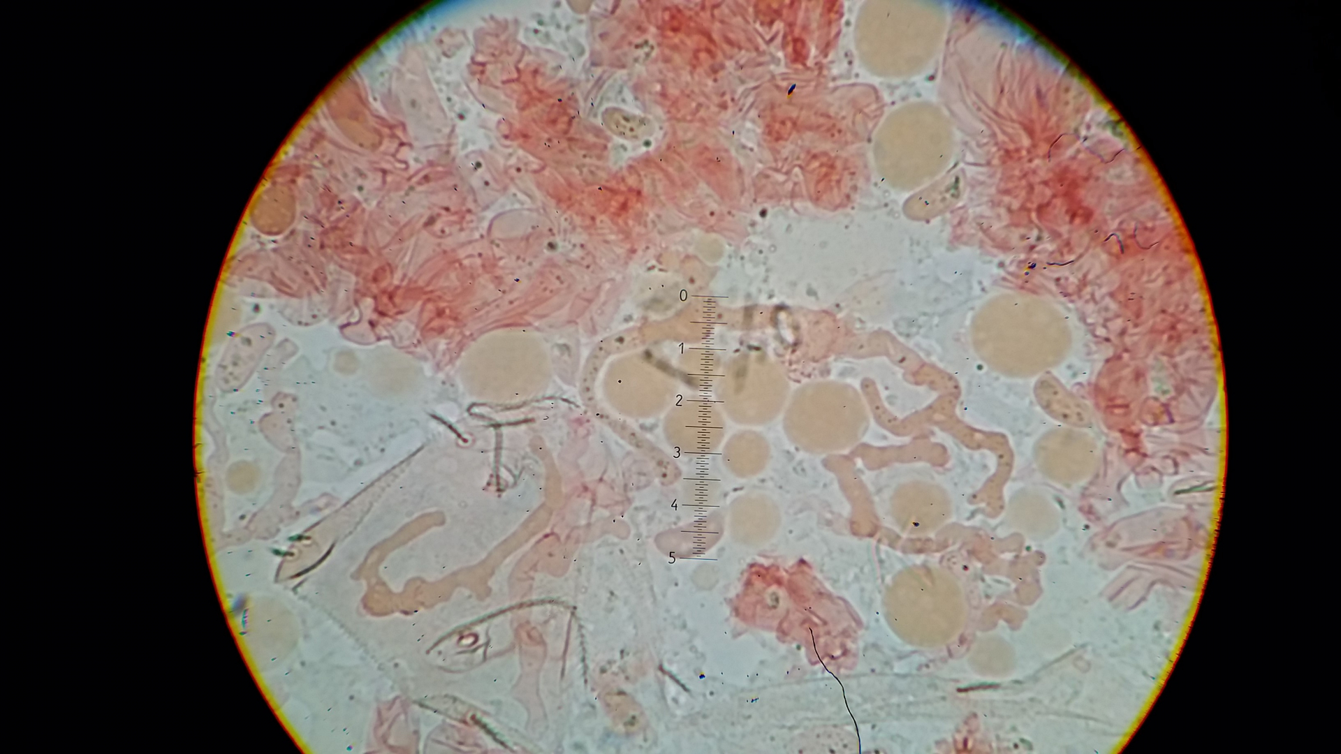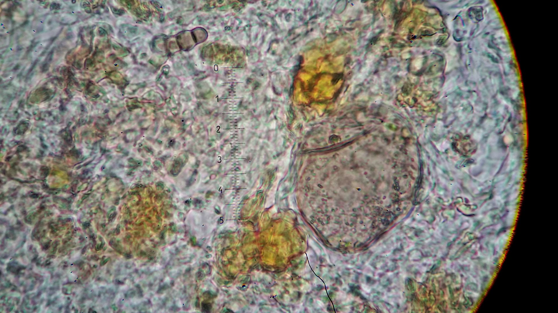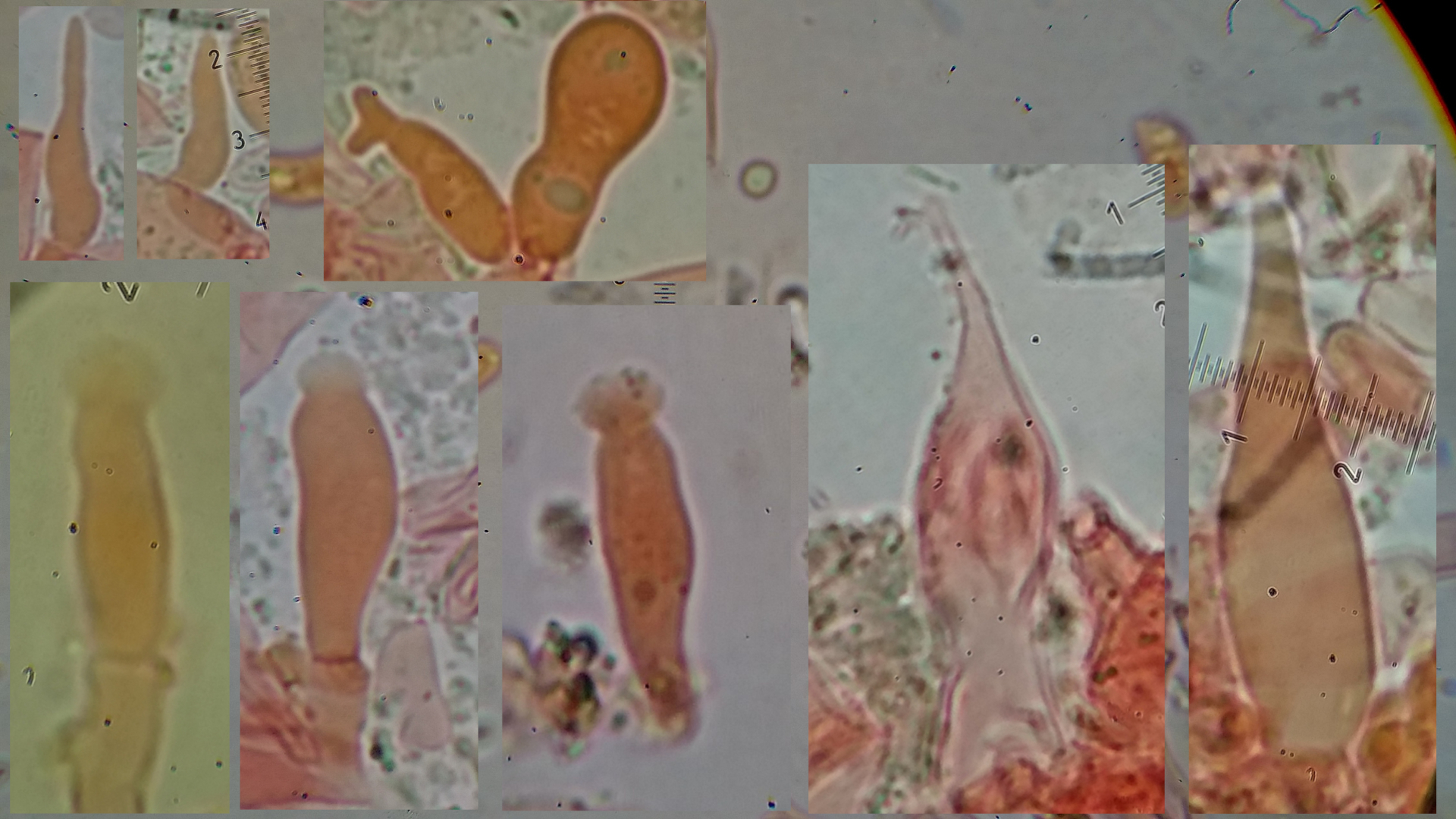 Unten links dürften Zystiden sein, apikal sind die mit etwas bedeckt, könnte Harz sein konnte aber auch was anderes sein, hier alles in KOH 3%