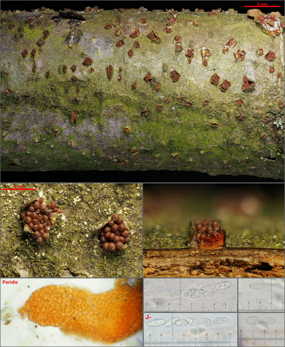 3. Makrokonidien 1−7 mal septiert, 5fach septierte Makrokonidien 50–70μm lang auf SNA; an diversen verholzten Wirten in Asien (China und Japan), Europa und Nordamerika ··························· Neo. punicea