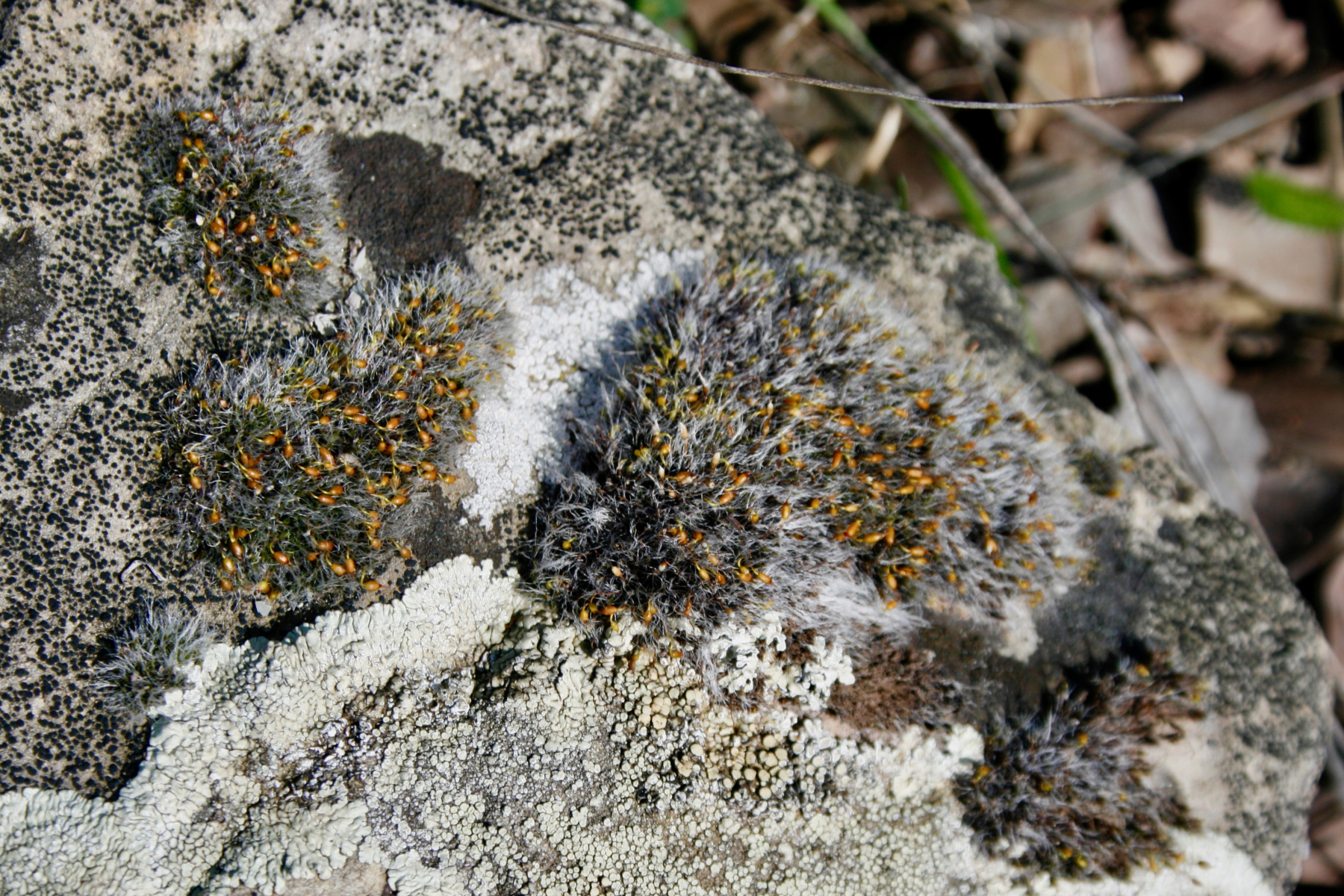 7 Ein blühendes Peltziermoos neben einer Krustenflechte auf einem Kalksandstein