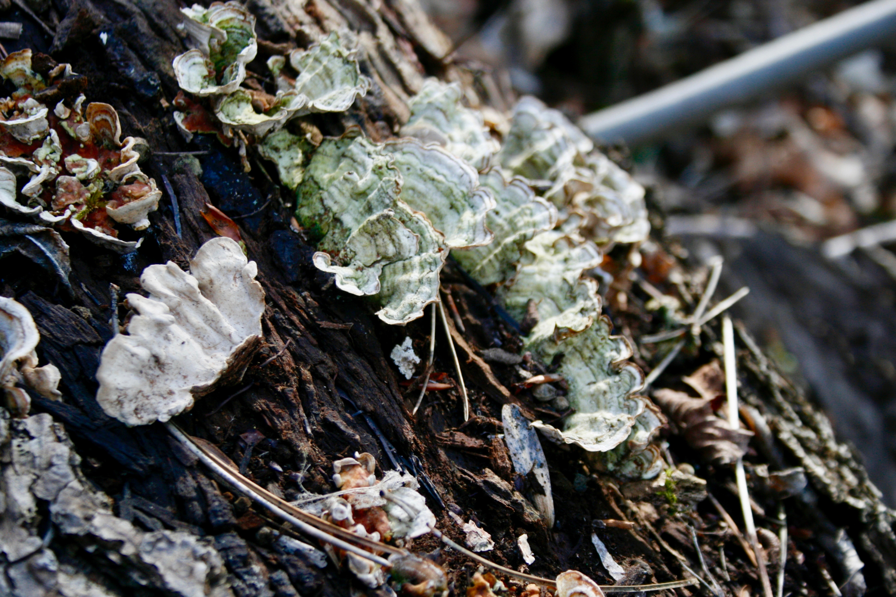 18 Auf dem Heimweg begegneten uns diese Trameten. Ob das wohl Albino-Schmetterlinge sind oder Ockertrameten? Auf alle Fälle sind sie heller als alle, die ich bis jetzt gesehen habe. Sie wachsen ohne jede dunkle Zonierung, dann sind es vielleicht doch Ockdertrametenen.