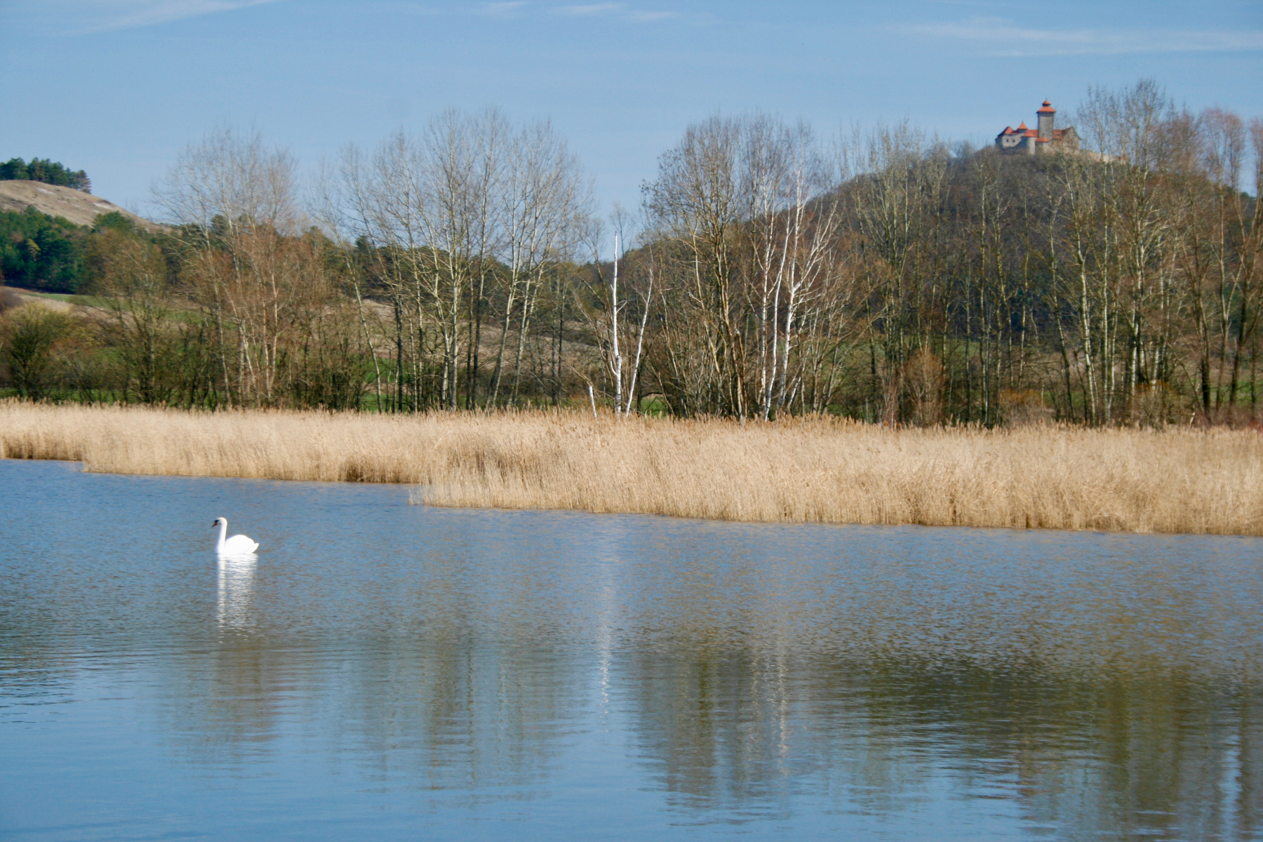 12 Ein ehemaliger Torfstich ist heute Naturschutzgebiet. Silberrreiher, Graugänse, ein Kormoran und etliche andere Wasservögel sorgten für eine Geräuschkulisse der besonderen Art und waren natürlich ein Augenschmaus. Das nächste Mal muss das Fernglas mit. Das hatten wir leider vergessen. im Hintergrund ist die Wachsenburg.