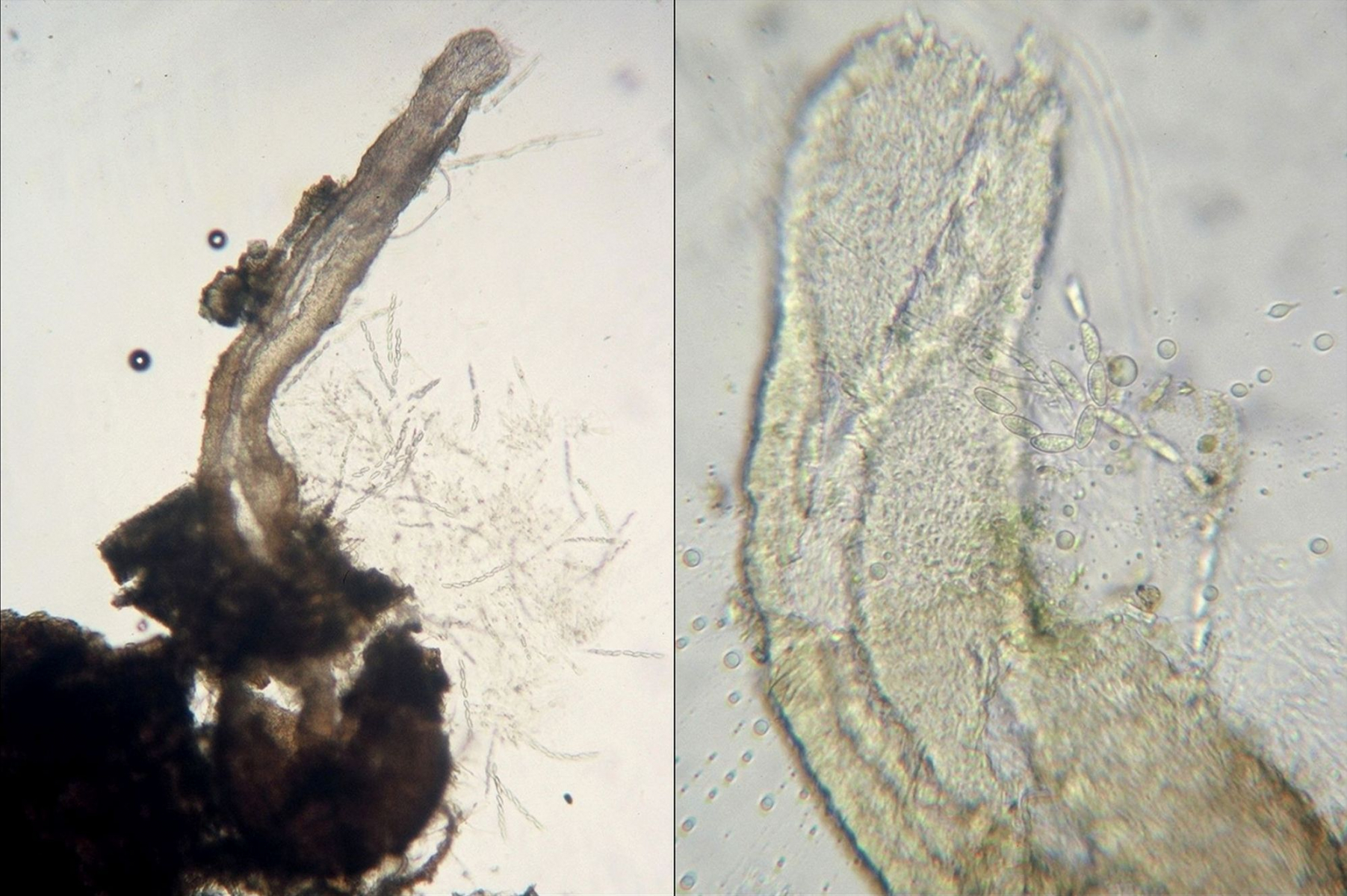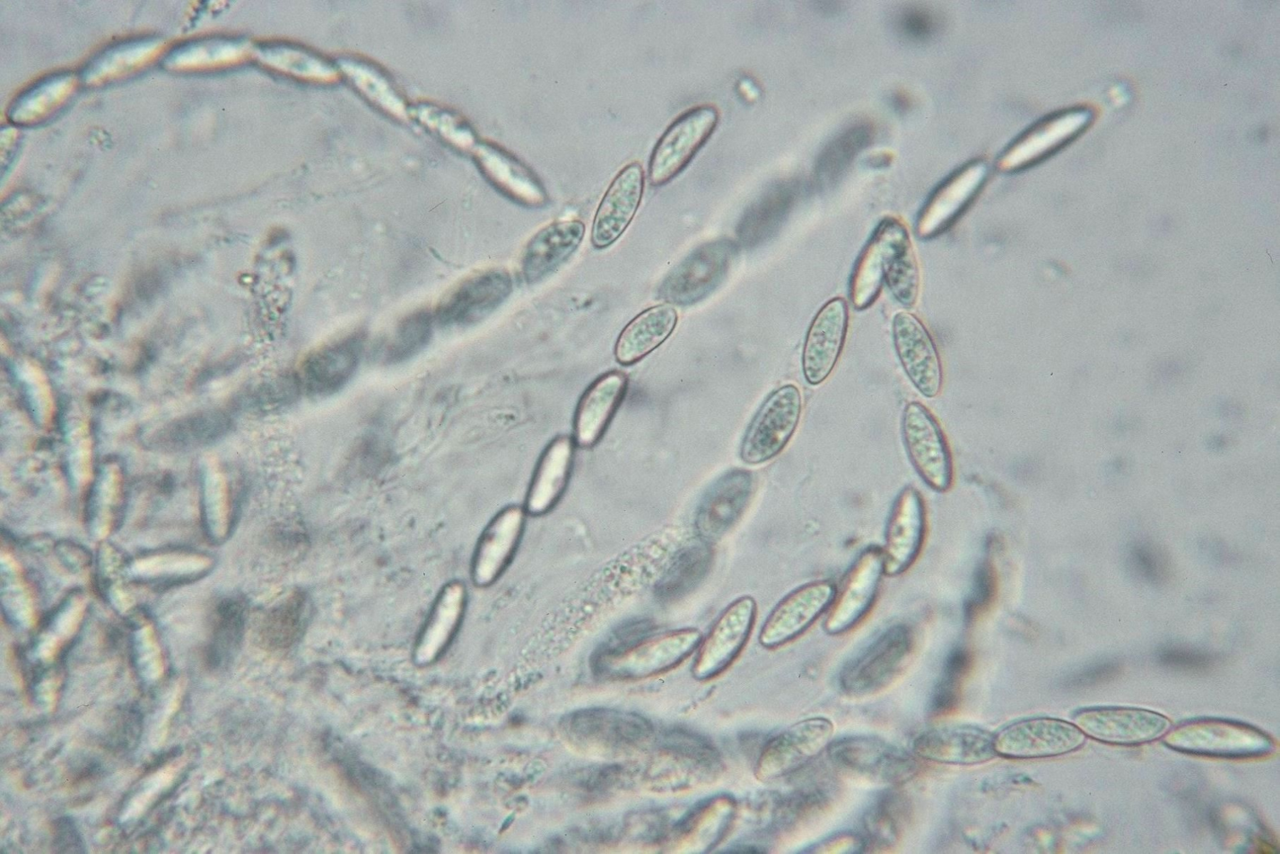 Die verdickten unteren Enden sind ins Holz eingelagert und beinhalten das was ich für Asci halte, die jeweils 8 Sporen beinhalten. Es ist ca 870µm lang und der Durchmesser am dünnen oberen Ende ca 80µm