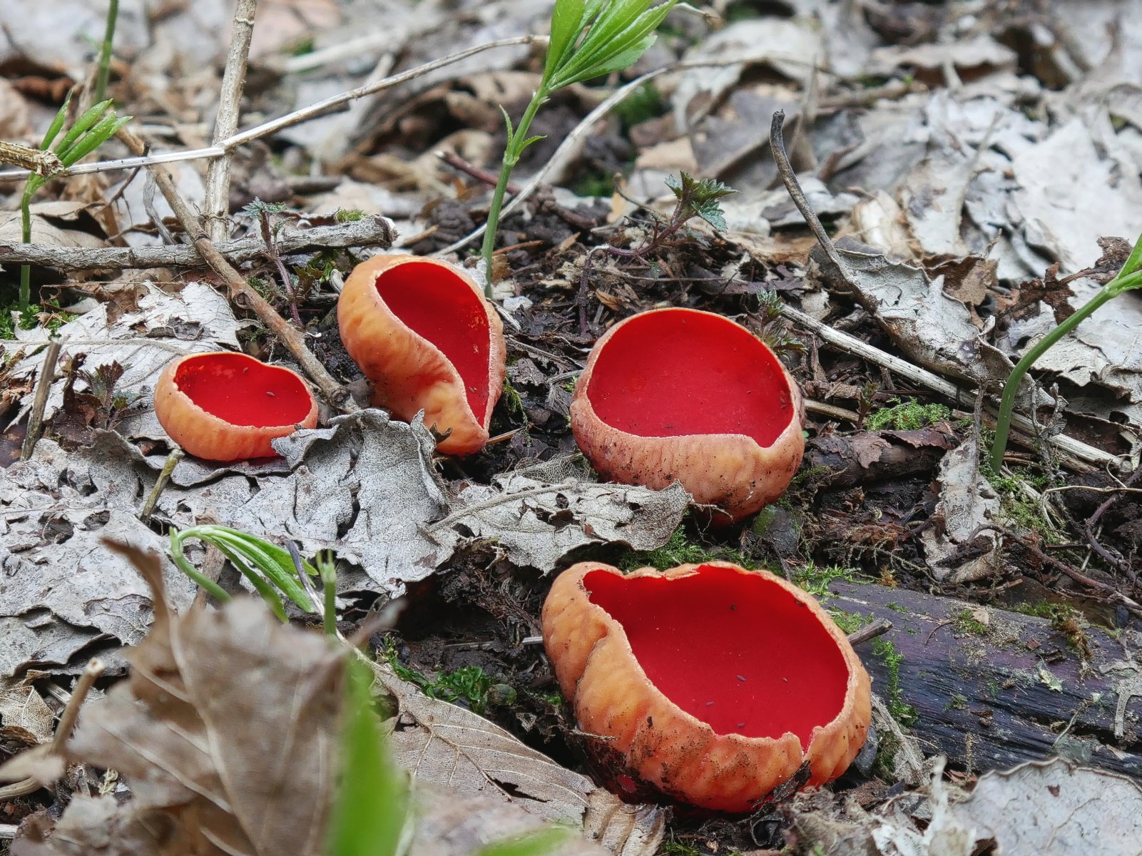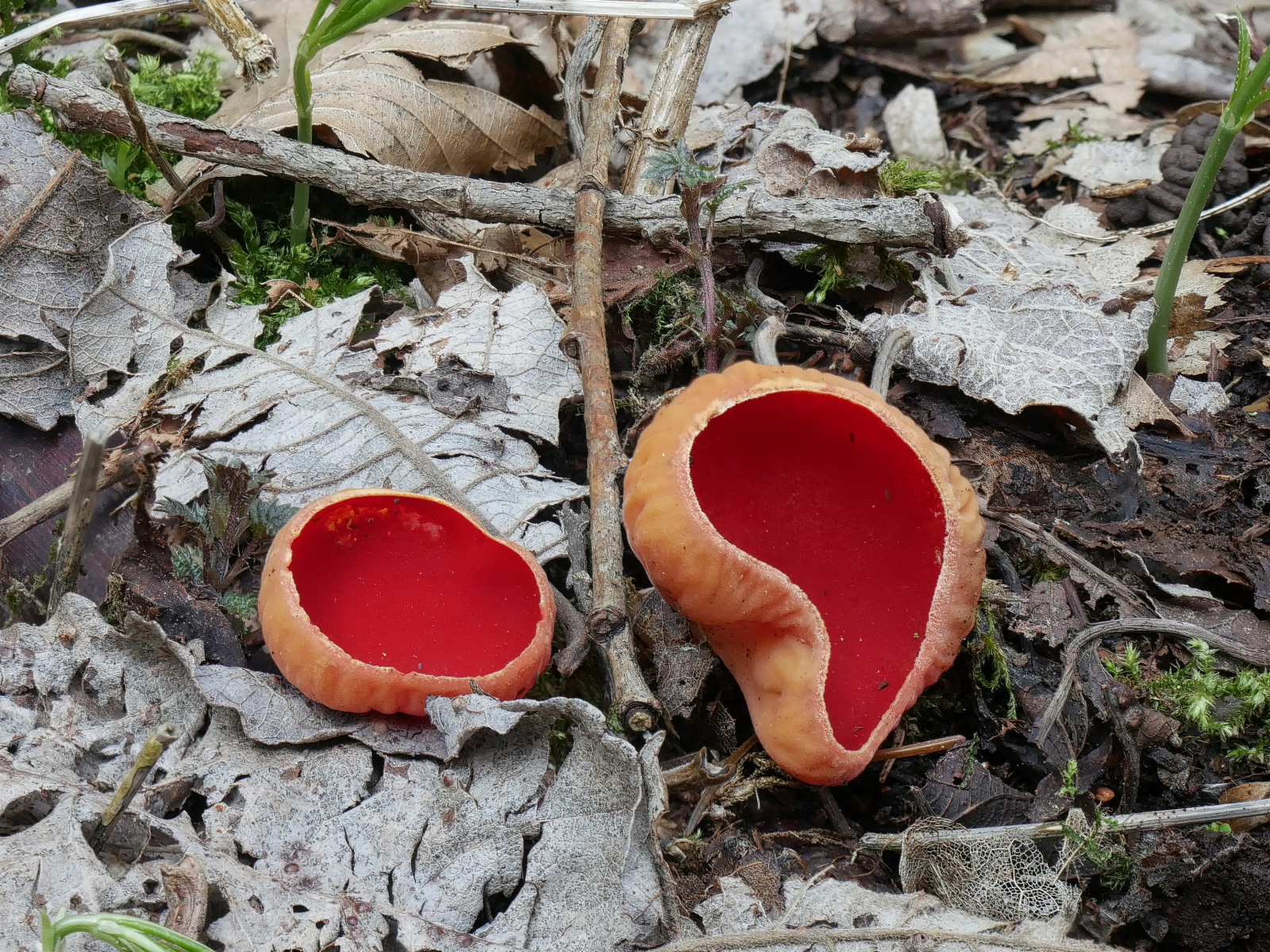 Ein schöner Fund an einer neuen Stelle waren diese Sarcoscypha. Ob des Biotops und des Habitus machten wir uns Hoffnung auf S. jurana. "Leider" war es dann doch "nur" austriaca, aber auch die ist in der Eifel keine häufige Art.