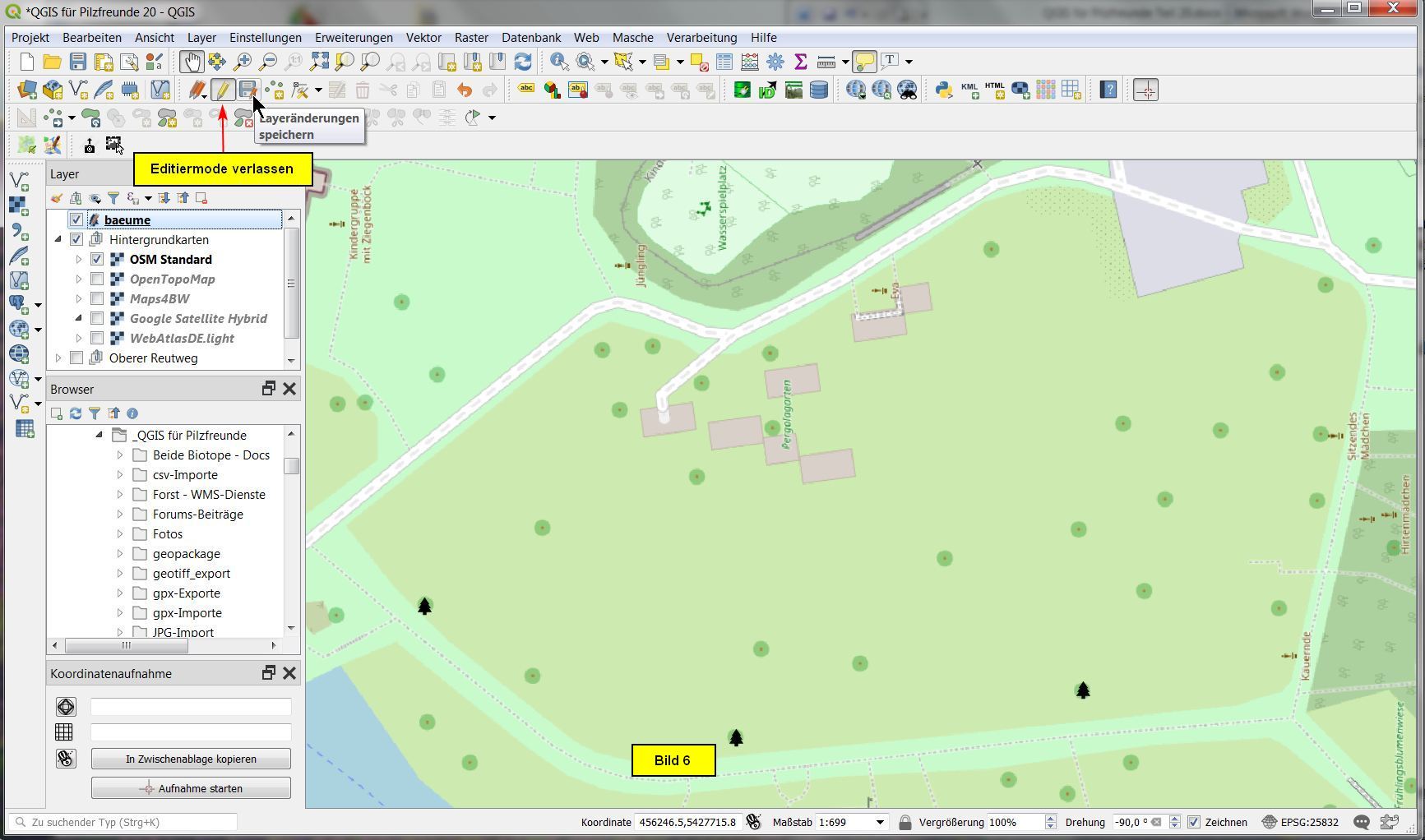 Sind die Daten aller zehn Bäume eingetragen, können wir die Layoutänderungen speichern und Editiermodus verlassen! Es ergibt sich folgendes Kartenfenster: