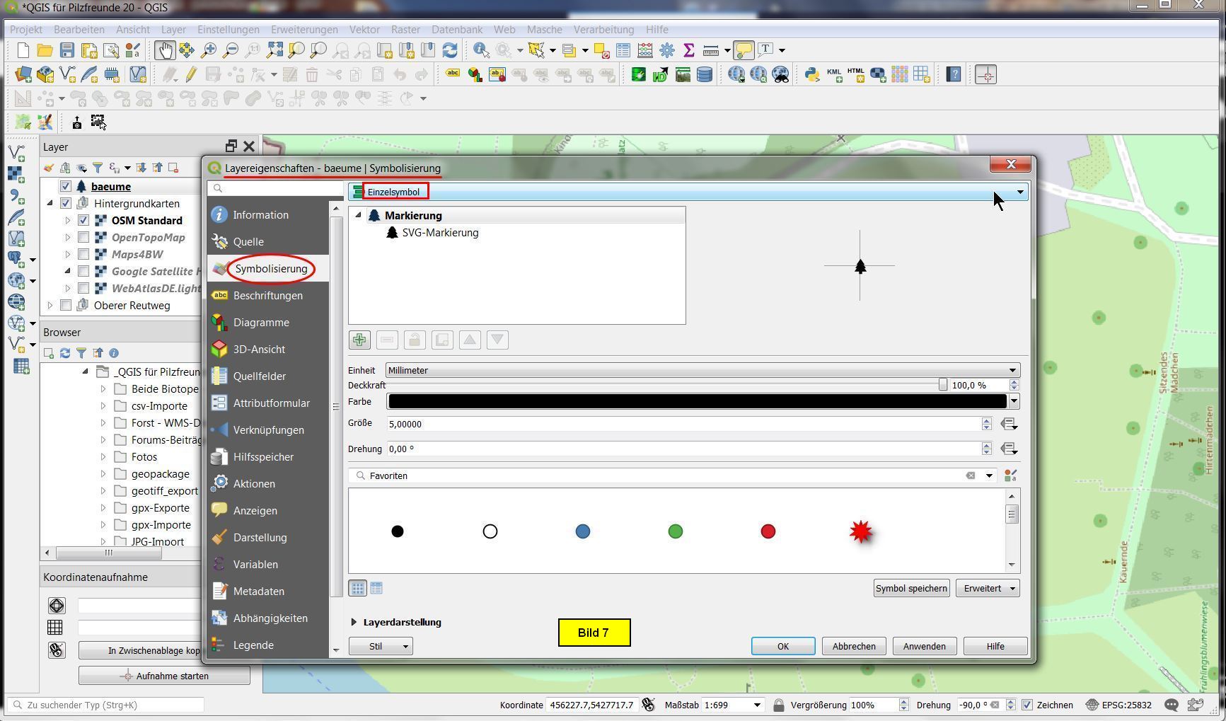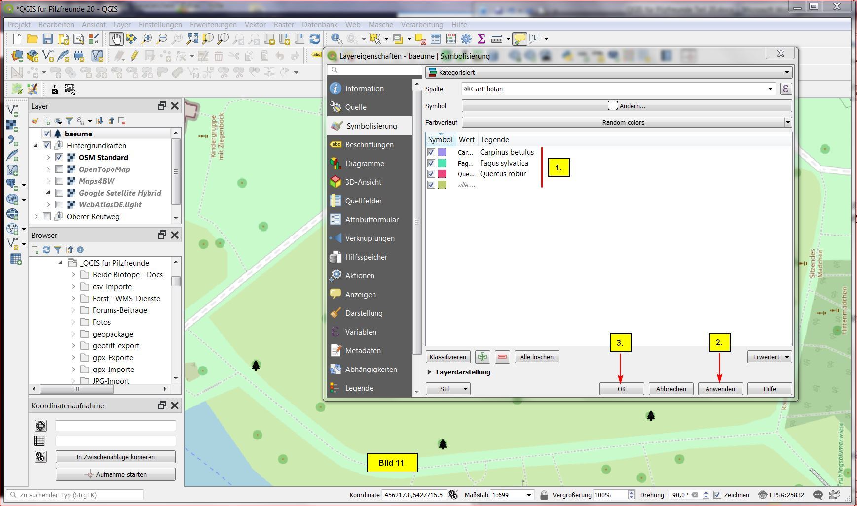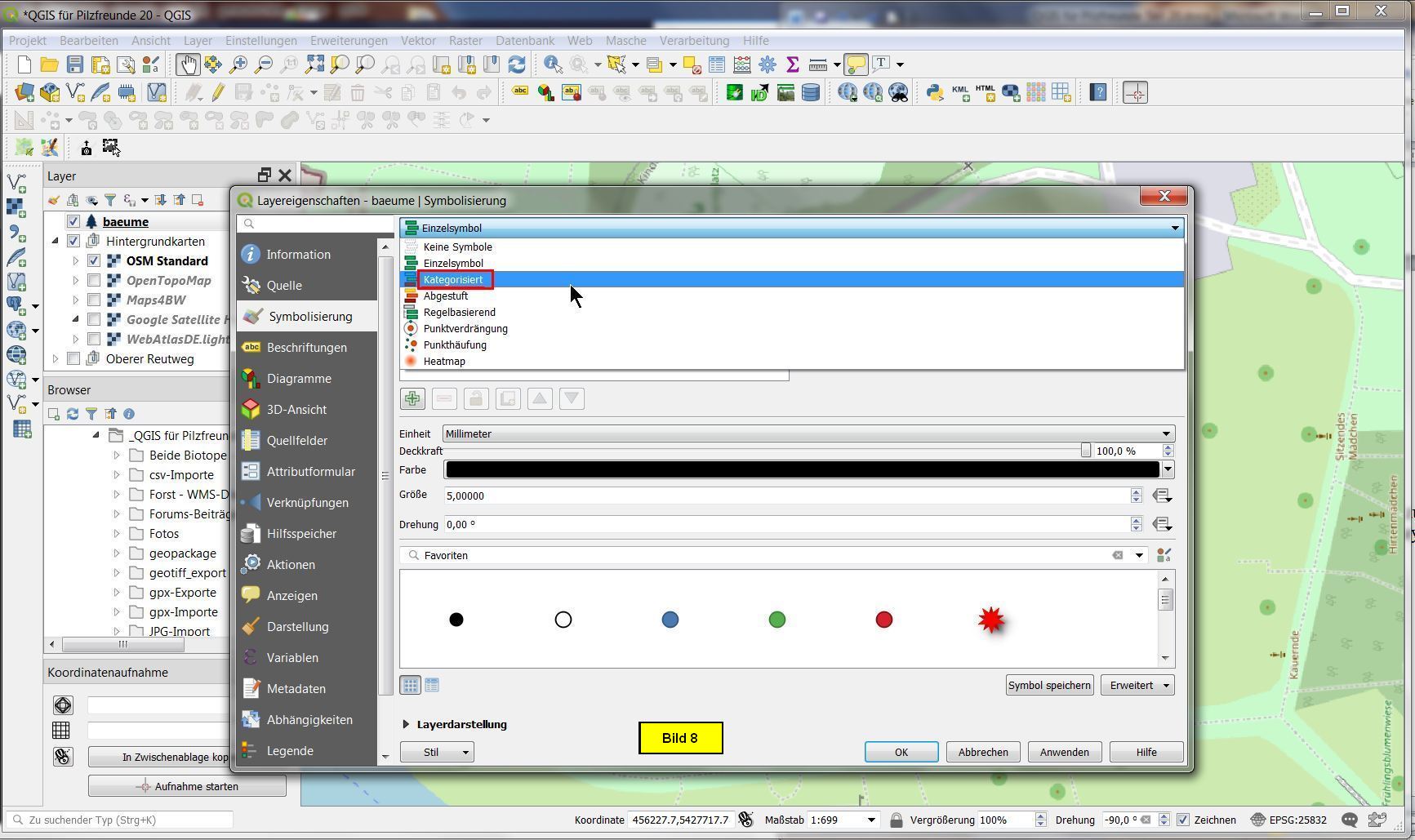 Die Kategorisierung nach der Baumart scheint mir zwecks Darstellung und Eingabe optimal zu sein. Dazu öffnen wir die Eigenschaften des Punktlayers baeume durch Doppelclick im Layerfenster und wählen das Untermenü Symbolisierung.