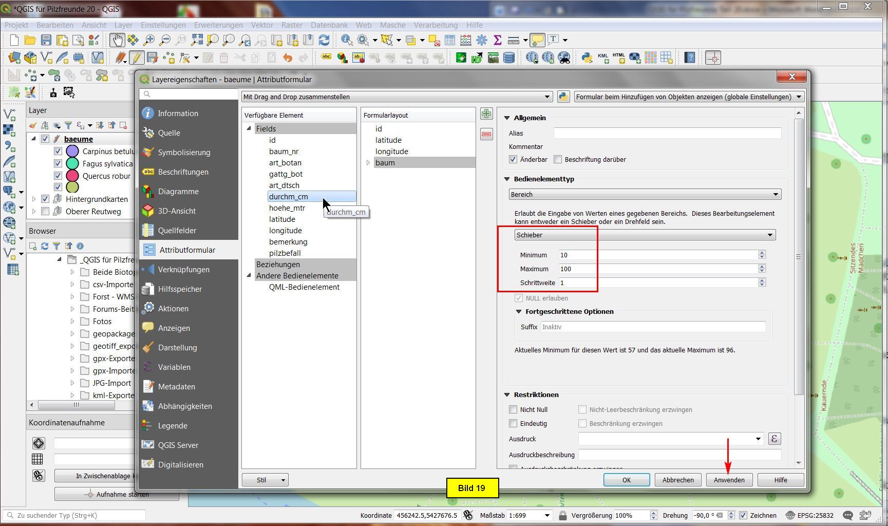Wir öffnen die Layereigenschaften des Layers baeume und selektieren Attributformular. Hier stellen wir von Automatisch erzeugen auf Mit Drag und Drop zusammenstellen um: