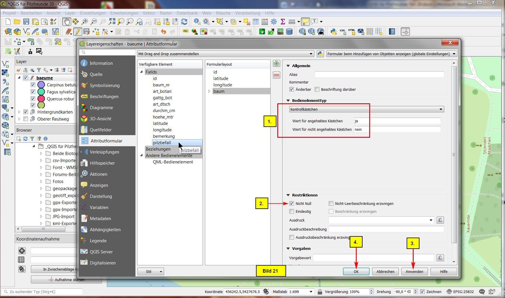 Für Pilzbefall soll ein Kontrollkästchen für Ja bzw. Nein vorgesehen werden. Der Haken bei nicht null bedeutet, dass das Feld pilzbefall ein Pflichtfeld ist.