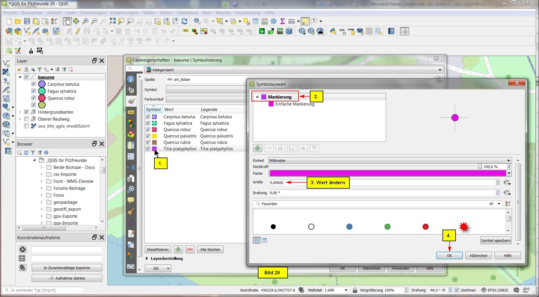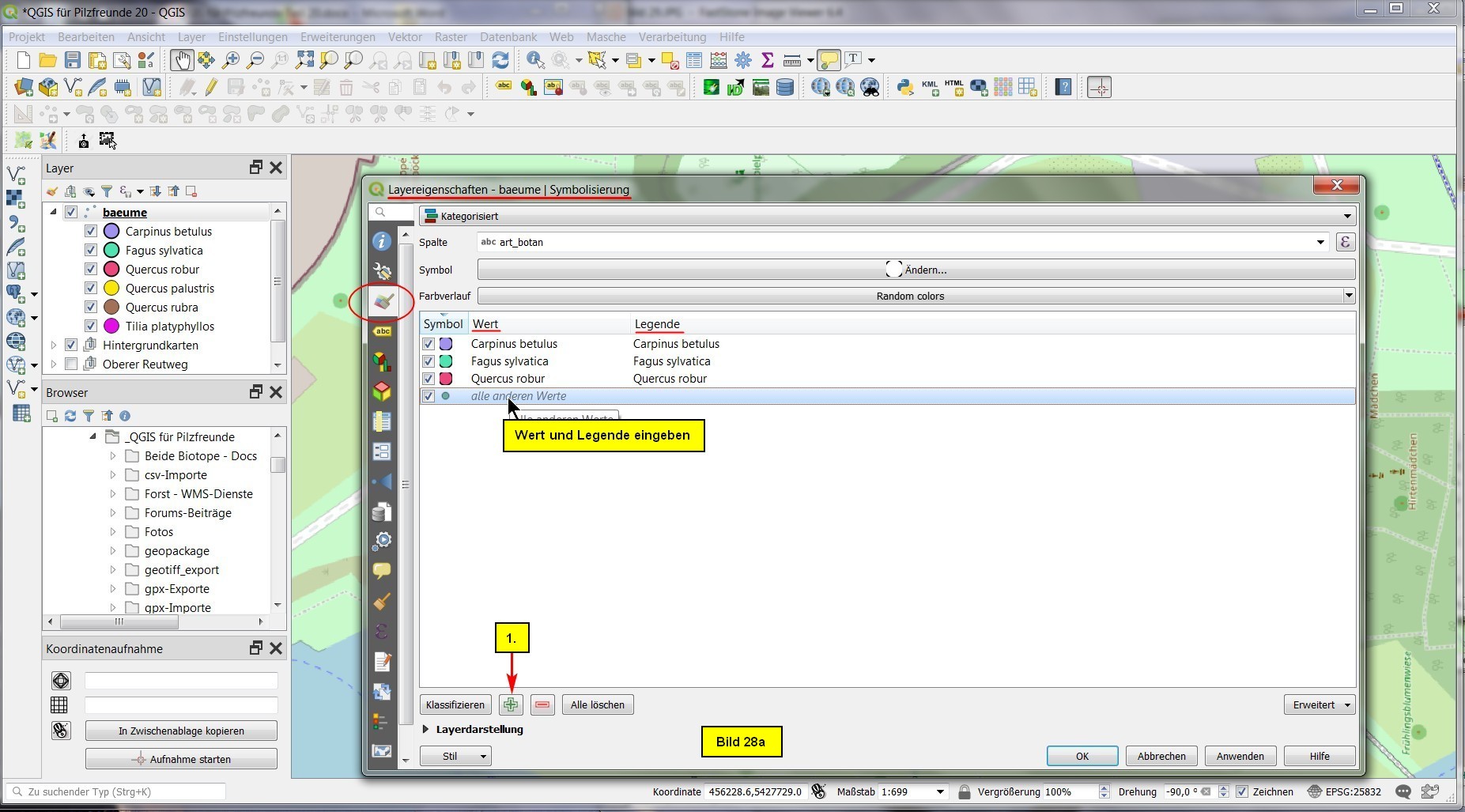 Die letzten drei Bäume Nr. 6, 9 und 10 haben diegleiche Farbe bekommen. Das sollten wir noch ändern, indem wir die Kategorisierung um die Arten: Quercus palustris, Quercus rubra sowie Tilia platyphyllos erweitern. Dazu öffnen wir die Layereigenschaften und selektieren das Untermenü Symbolisierung. für jede hinzukommende Kategorie clicken wir auf das grüne Pluszeichen und geben bei Wert und Legende die entsprechender Bezeichnung ein:
