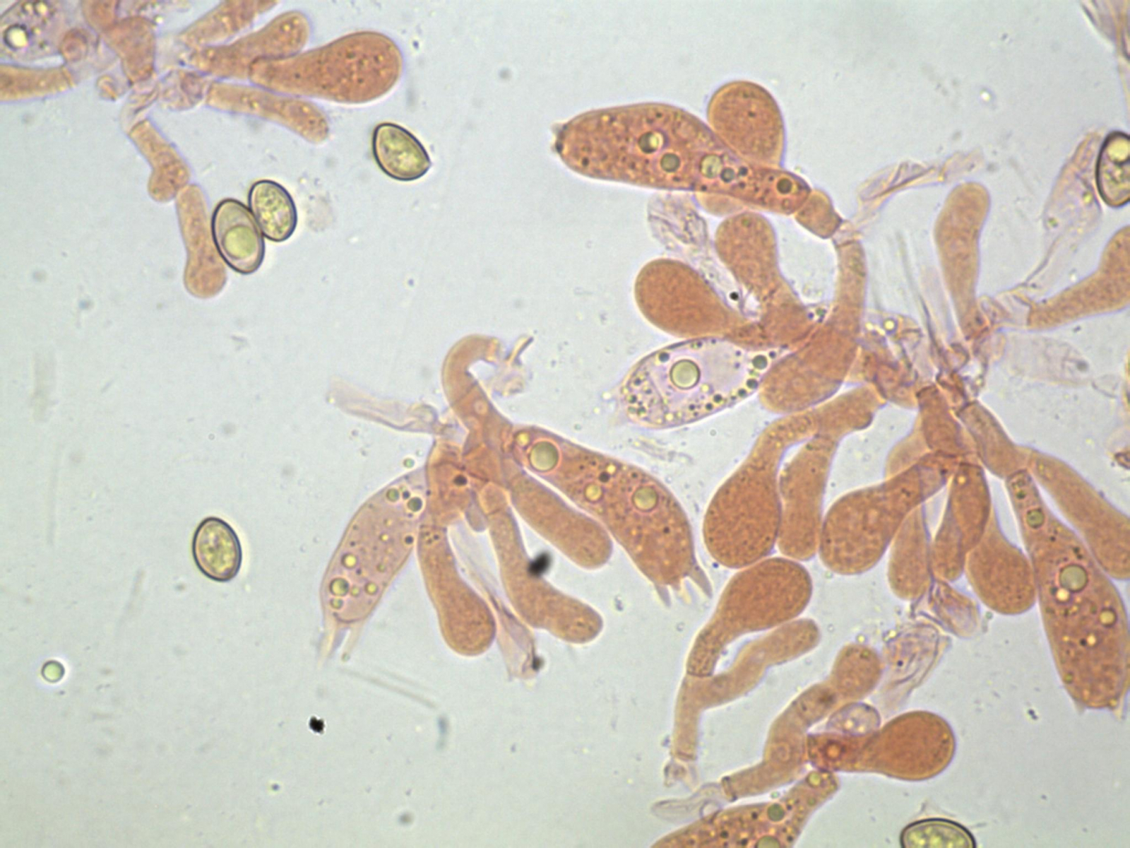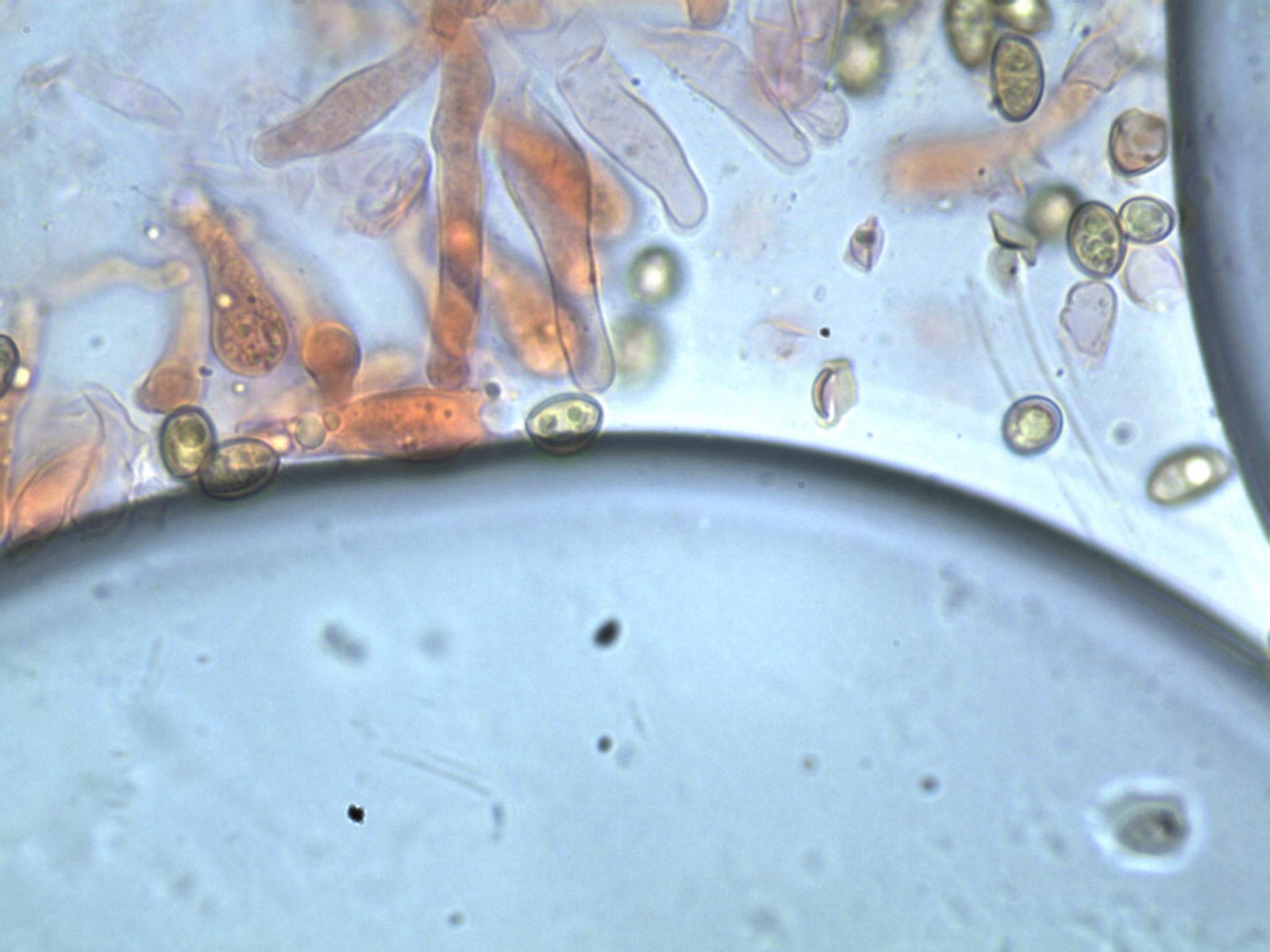 Sporen: glatt, eiförmig, mit Apikulus, dickwandig, 8.4 × 5.5 µm ; Q = 1.5;