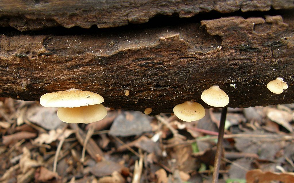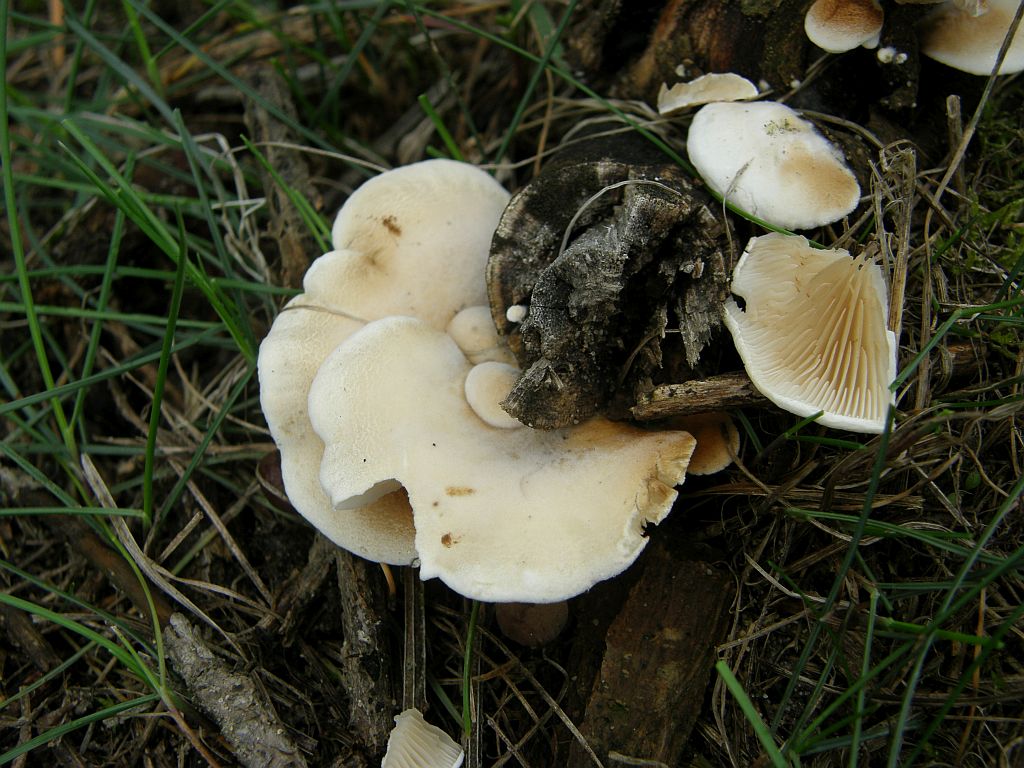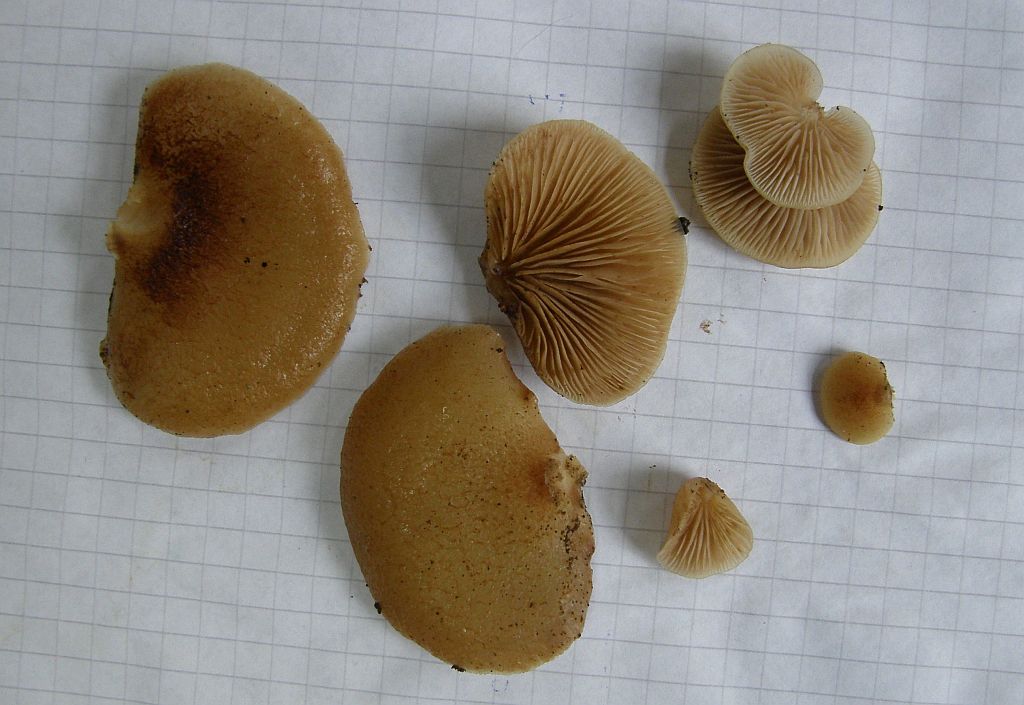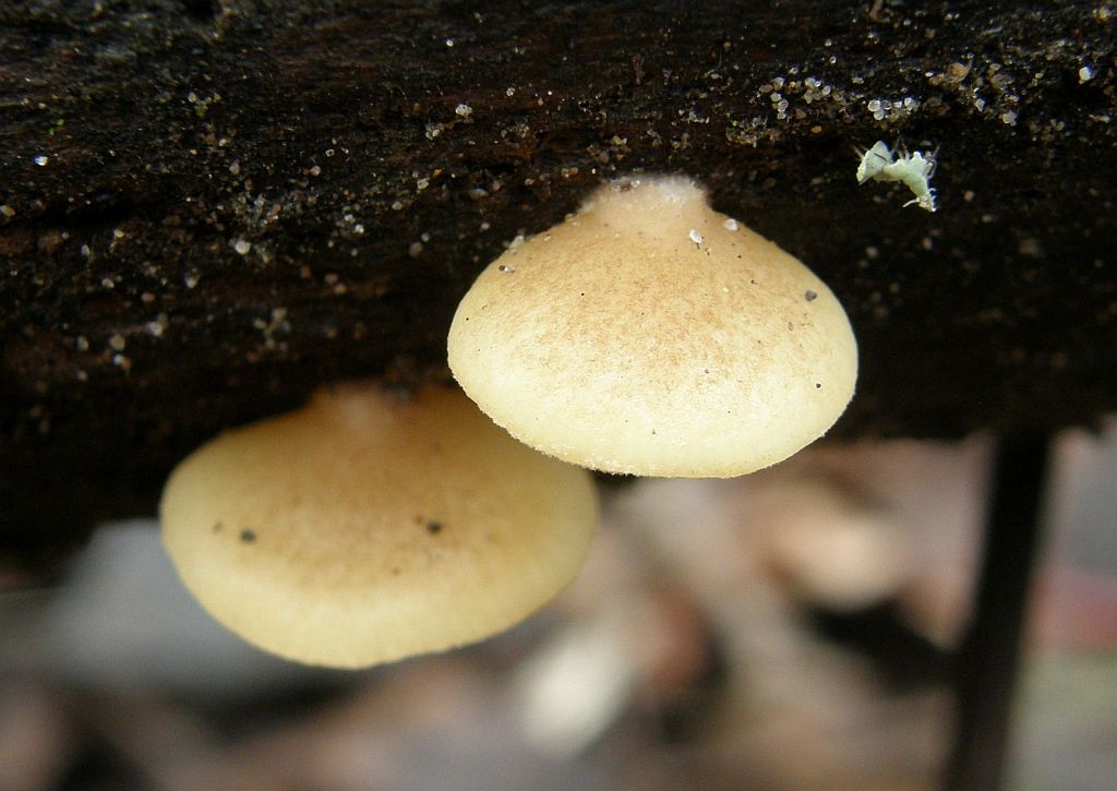 Ein Seitlingsähnlicher Pilz mit dunkelbraunem Sporenpulver.