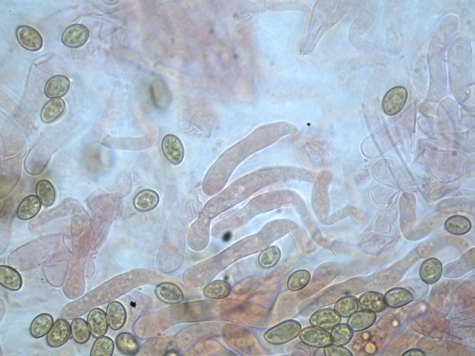 Sporen: glatt, eiförmig, mit Apikulus, dickwandig, 8.4 × 5.5 µm ; Q = 1.5;