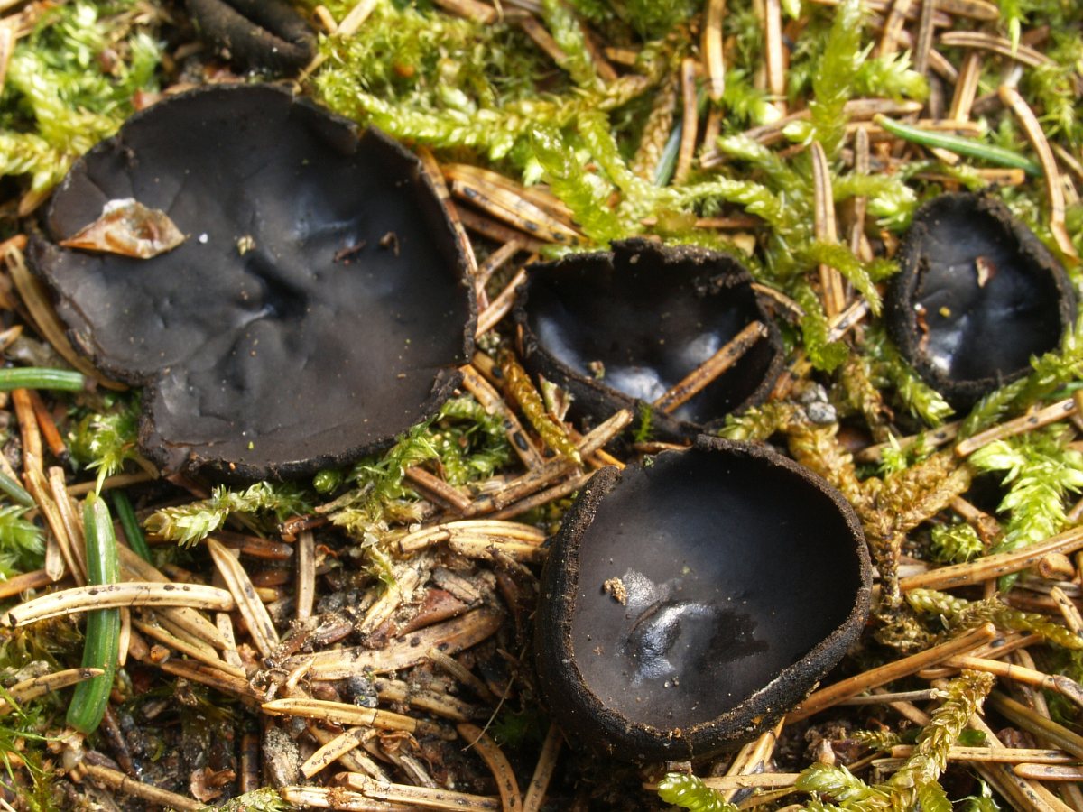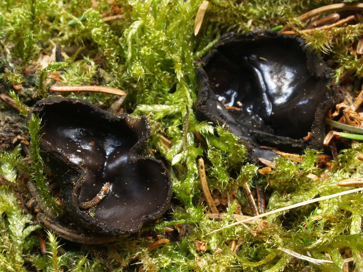 In einem sauren Fichtenwald entdeckten wir noch einige Exemplare des Glänzenden Schwarzborstlings (Pseudoplectania nigrella)