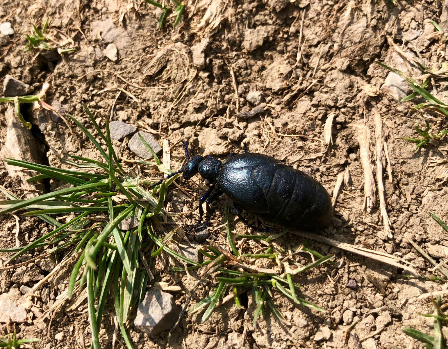 Der Käfer ist ein Ölkäfer. Welche Art genau, weiß ich nicht 100%, aber es könnte der Violette Ölkäfer sein. Der ist auf jeden Fall was Interessantes, denn er enthält ein besonderes Gift und hat einen sehr speziellen Entwicklungszyklus. Lies mal hier: Violetter Ölkäfer – Wikipedia