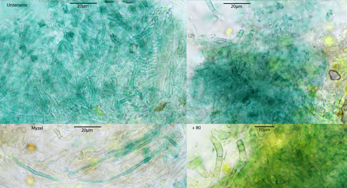 Auffällig war noch, dass die grüne Farbe bei KOH-Zugabe fast ganz verschwindet (bzw. allenfalls schwach grasgrün wird), mit anderen Reagenzien bleibt die da, z.B. Lugol, wir da natürlich erwartungsgemäß etwas mehr gelblich.