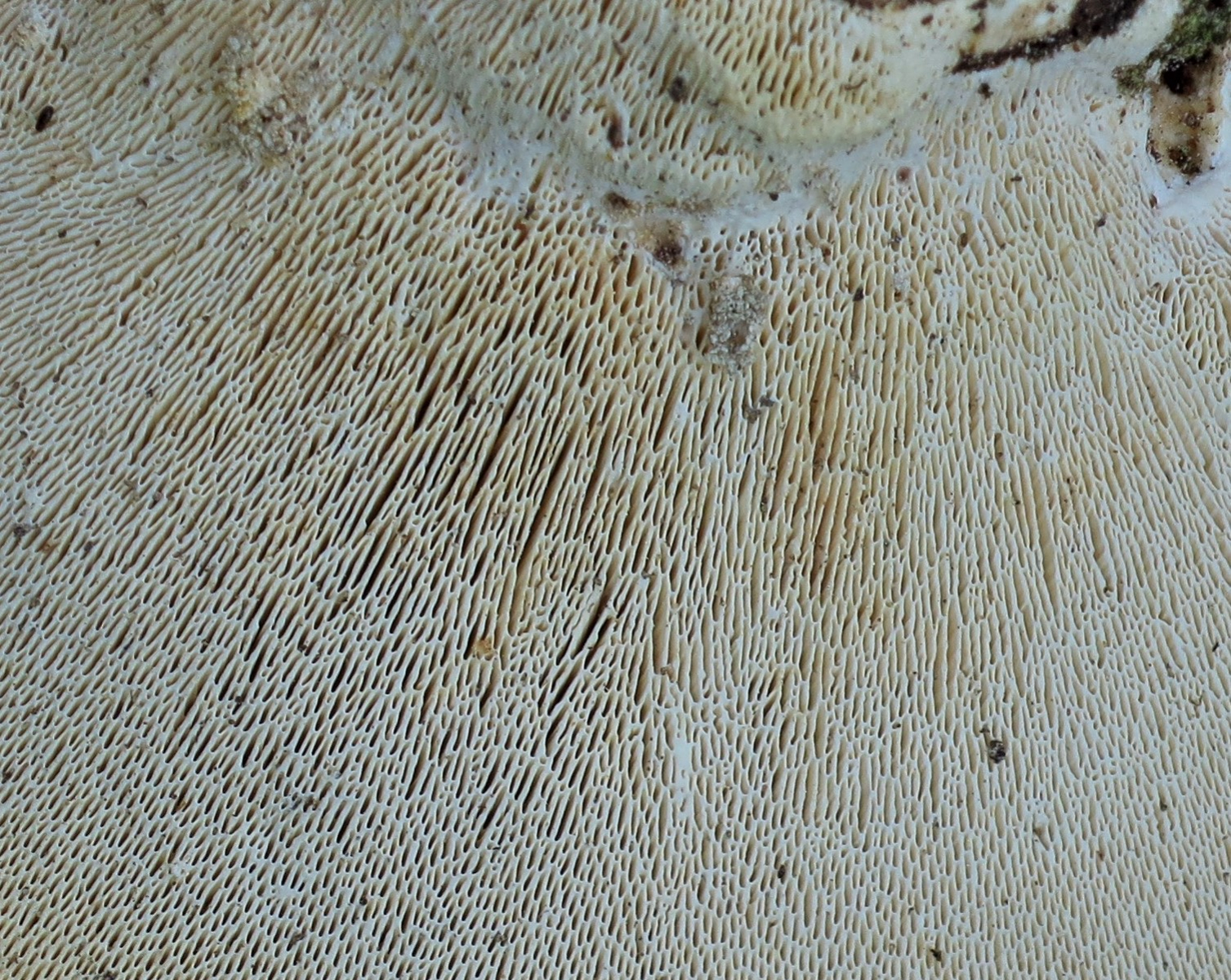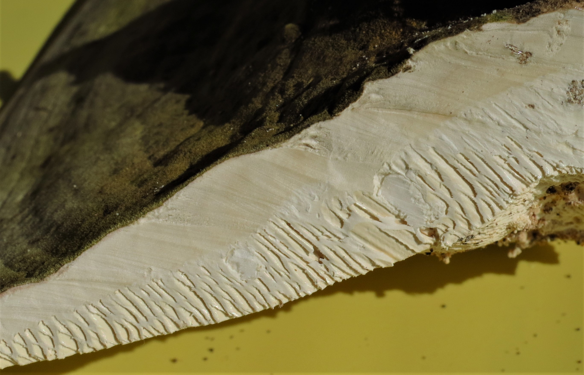 Farbe: Hutfarbe grün-bräunlich mit weißem Rand, Poren weiß bis hell cremefarbig