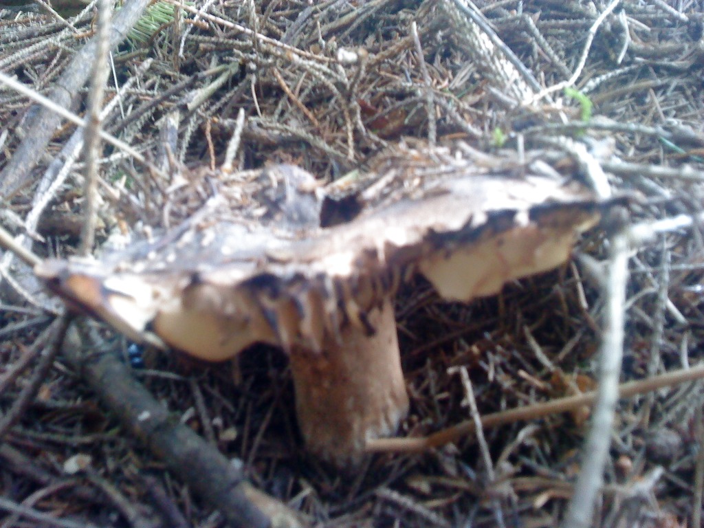 Einer der Schwärztäublinge (Russula), wahrscheinlich der Dickblättrige Schwärztäubling (Russula nigricans).