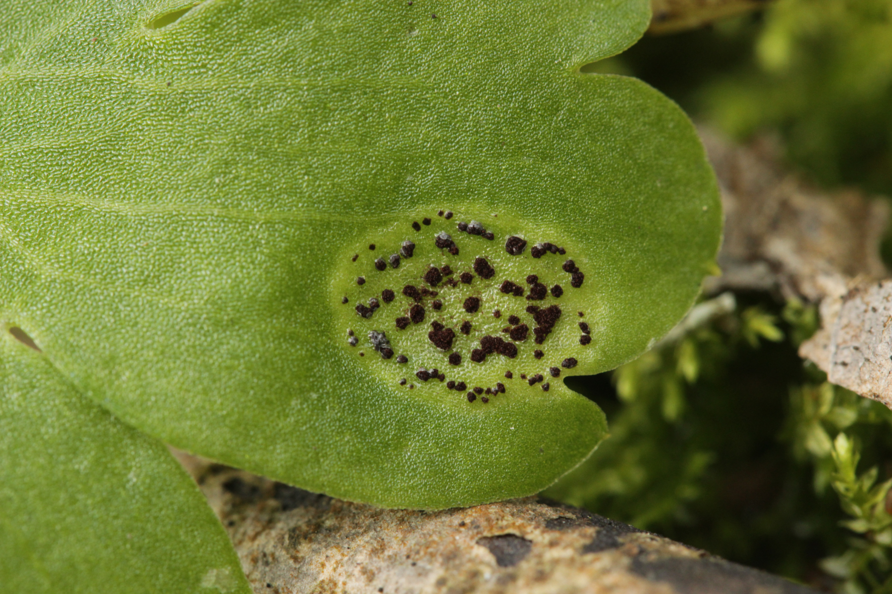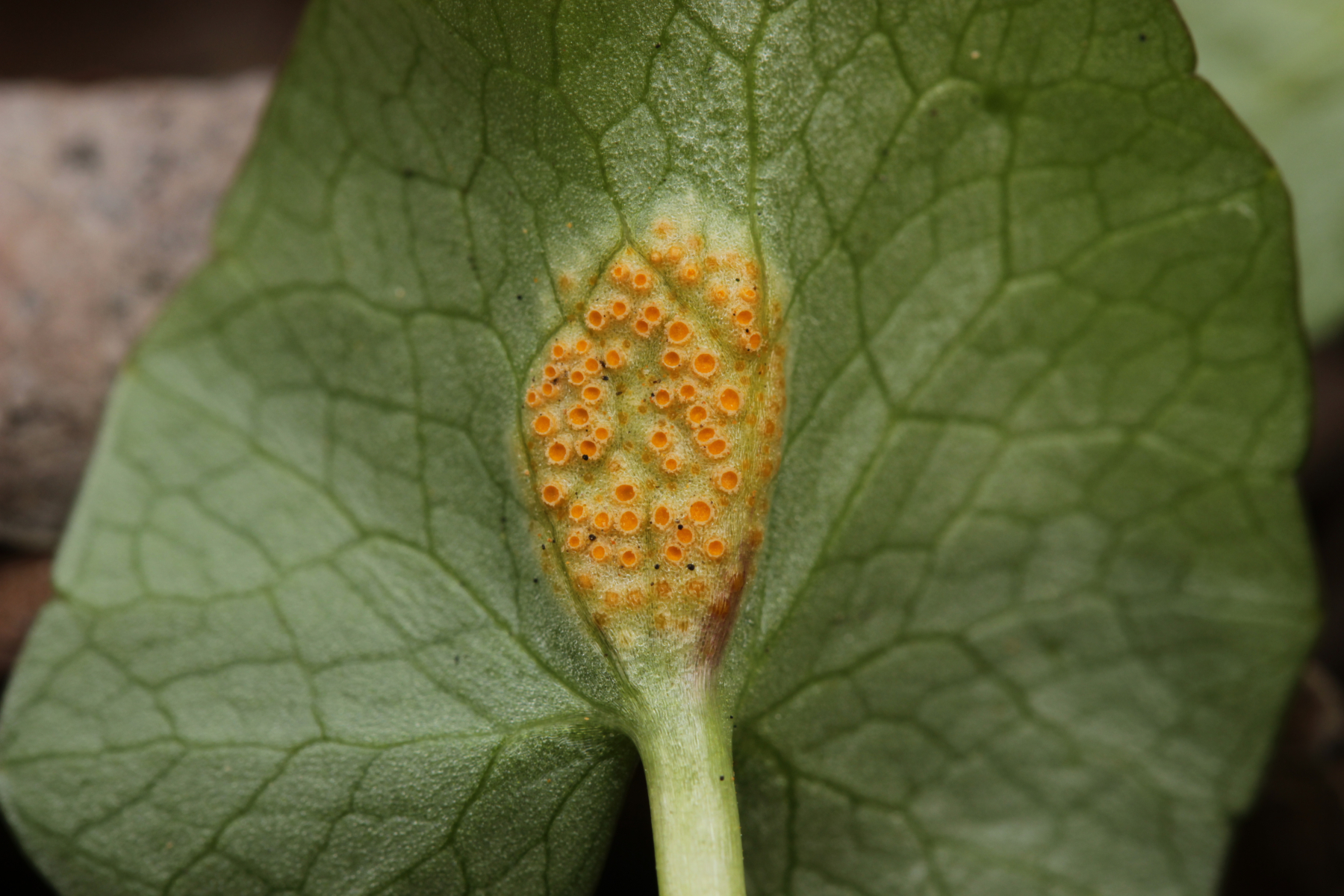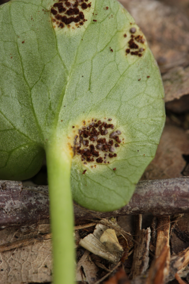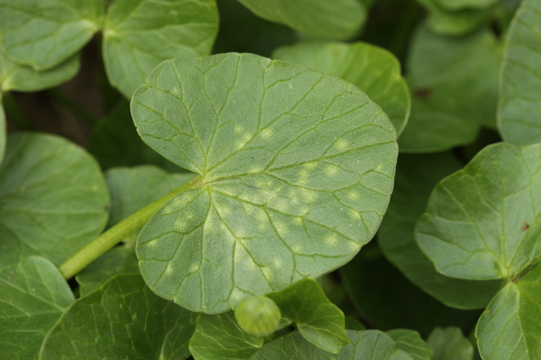 2. Puccinia sp. auf Ficaria verna. Die Pflanzen waren nicht sonderlich verformt und die Sporengröße spricht auch eher für P. poae.