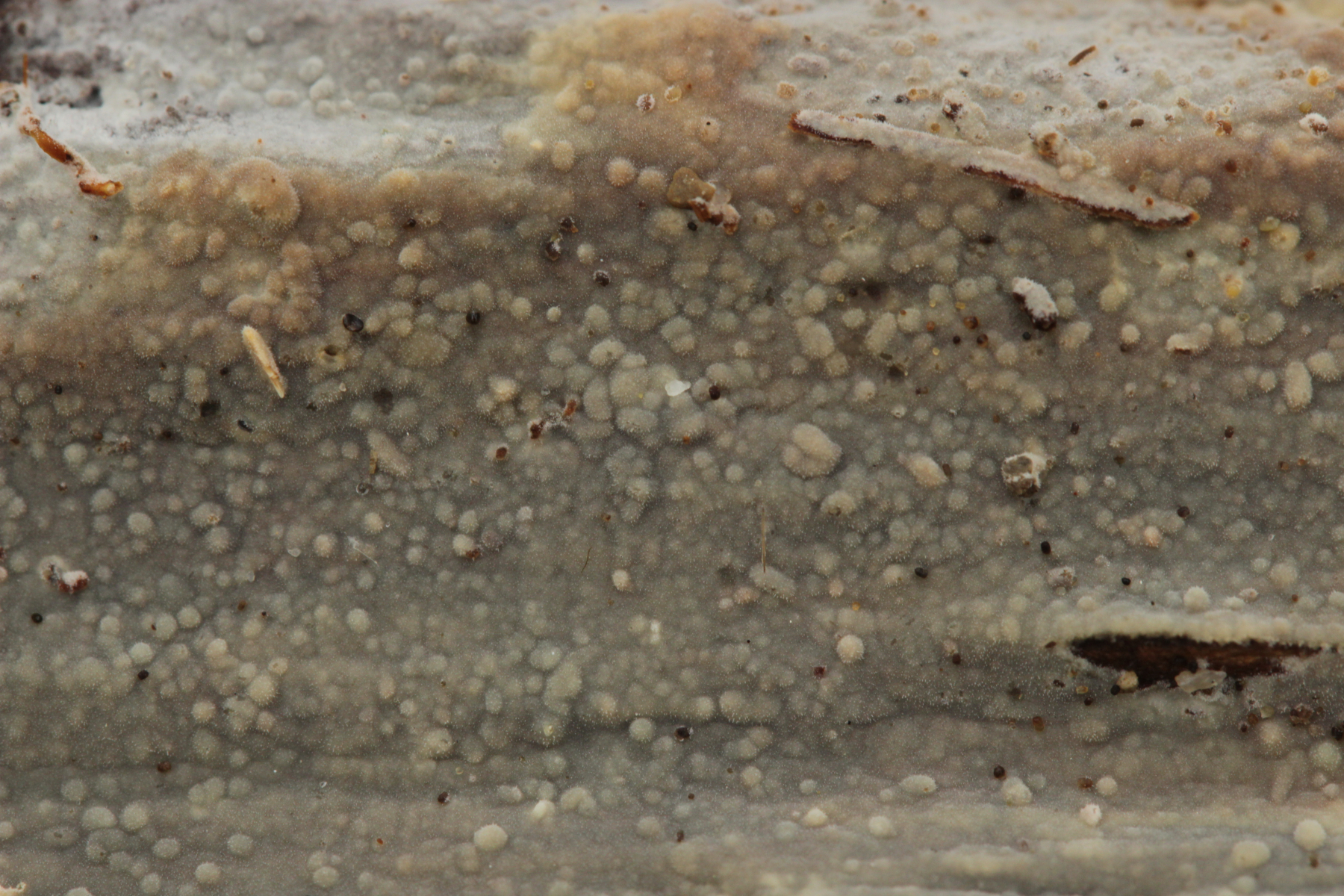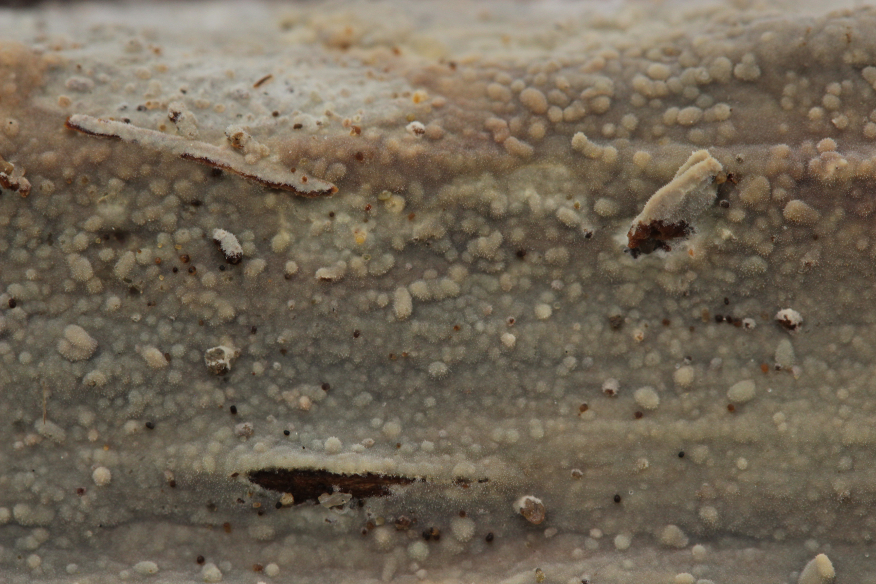 Die Zystiden und die dichten Hyphenstrukturen von dem Corti (8) erinnern mich an Peniophorella pubera. Die hatte ich aber noch nicht mit so warzigen Fruchtkörpern, und normalerweise sind die relativ großen Sporen bei der Art leicht zu finden. Man kann sich ohne Sporen dann aber auch noch an den (manchmal zunächst schwer zu sehenden) Gloeozystiden orientieren: Wird zwar oft verschwiegen, aber die hat Peniophorella pubera eben auch, zusätzlich zu den Lamprozystiden.