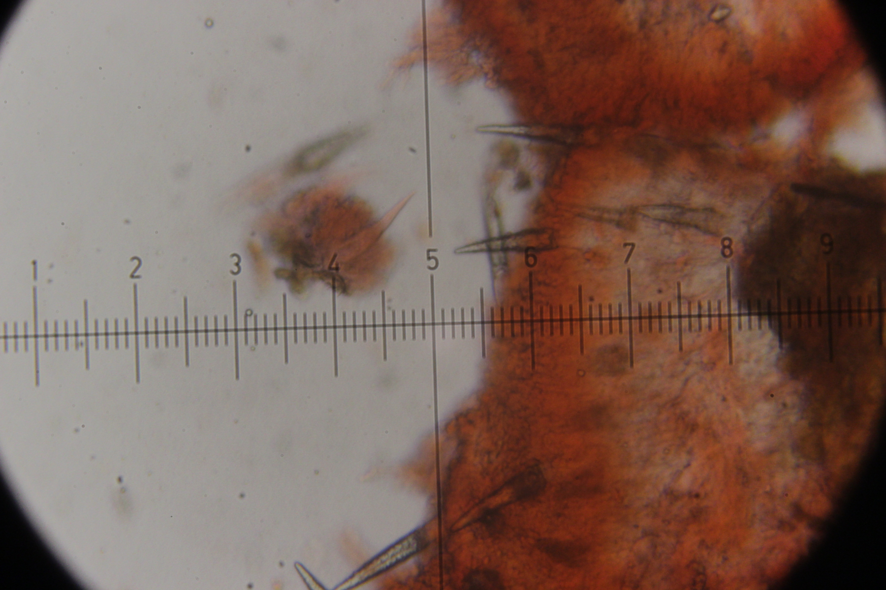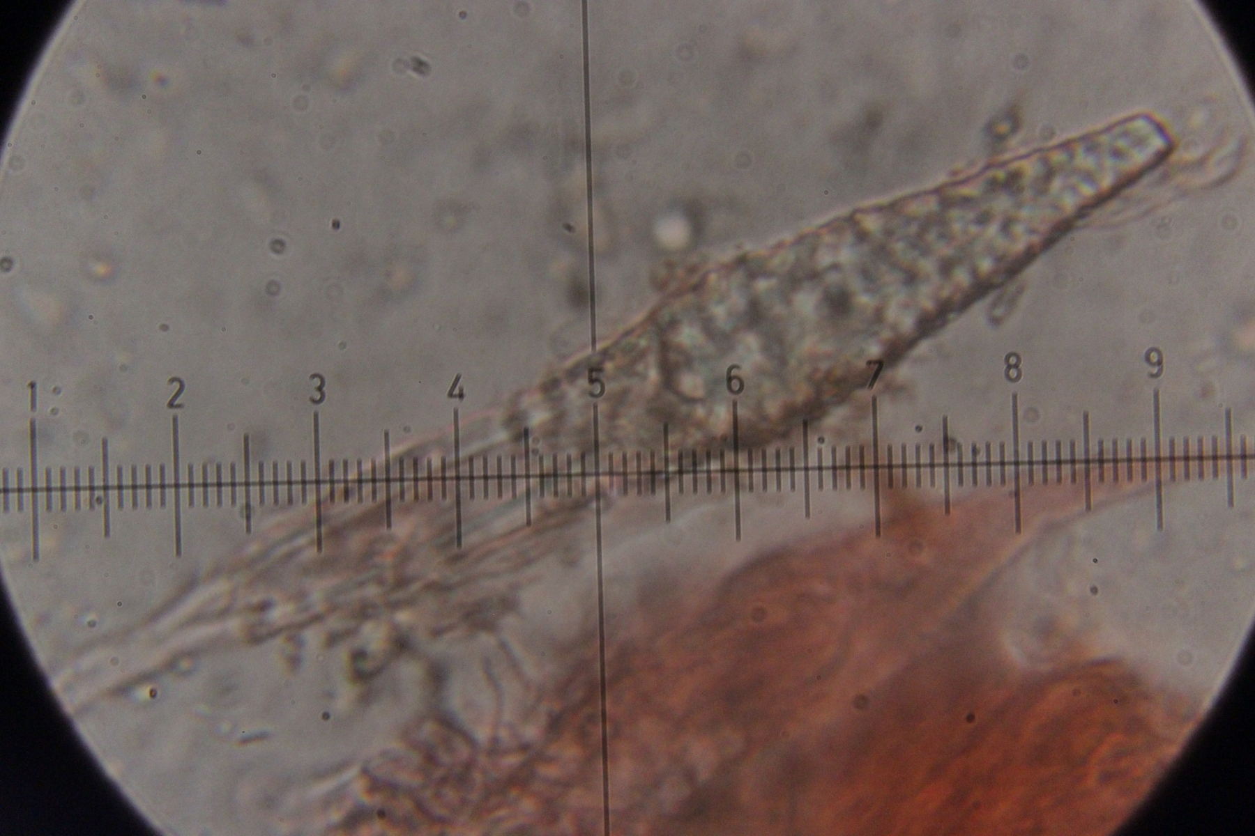So, kurz vom Abschicken noch mal ein Blick durchs Mikroskop. Also vereinzelt sehe ich da zystidenartige Dinge, deren Inhalt hellviolett gefärbt sind. Leider liegen die alle so, daß man sie nicht gescheit in einem Rutsch scharf fotografieren kann.