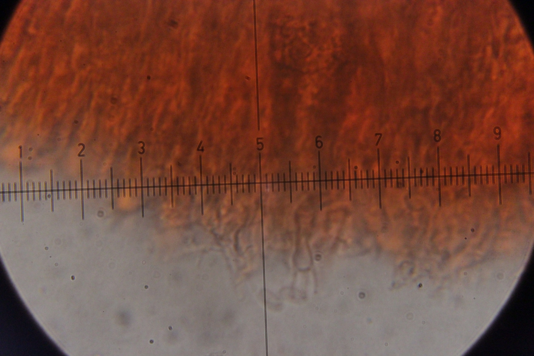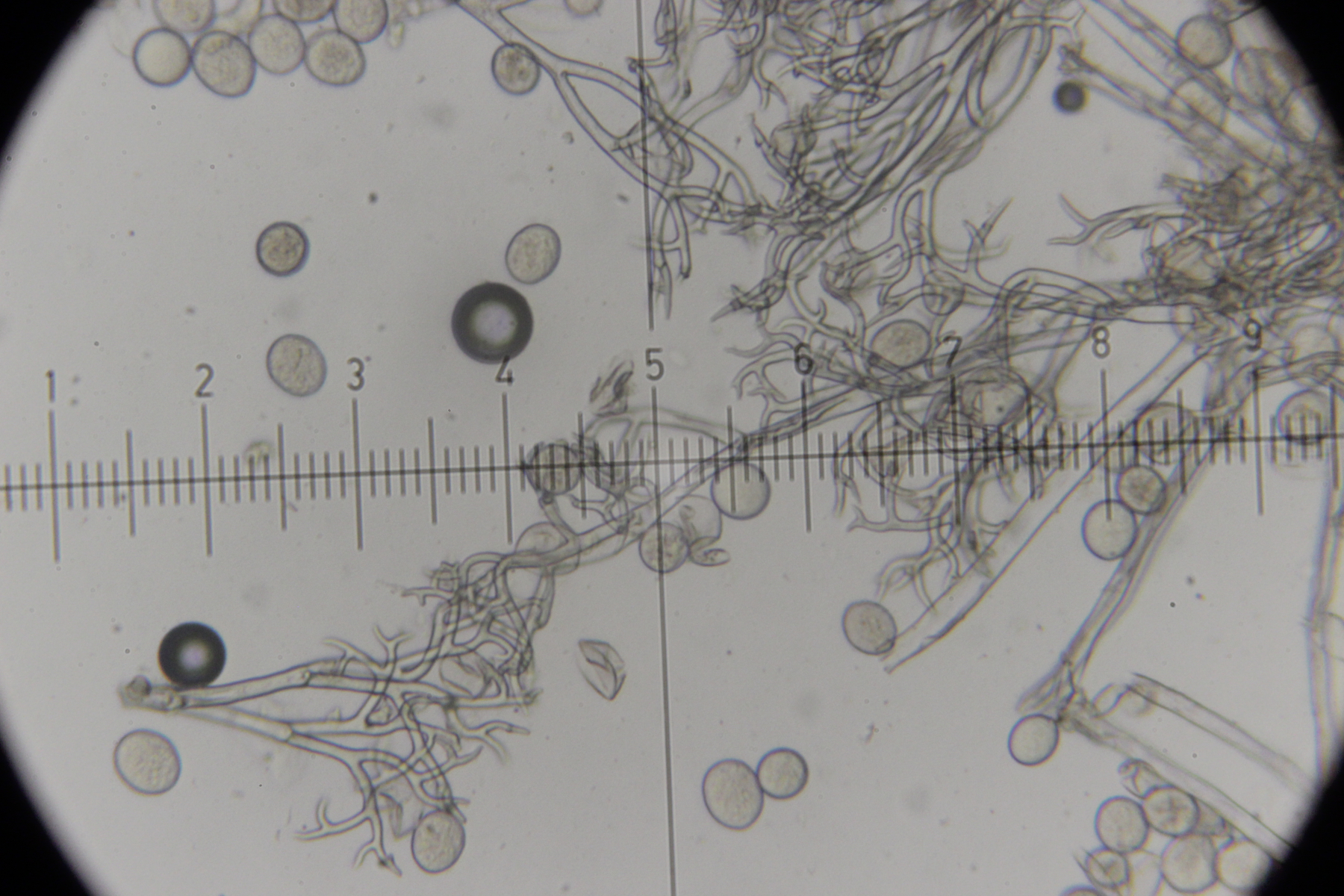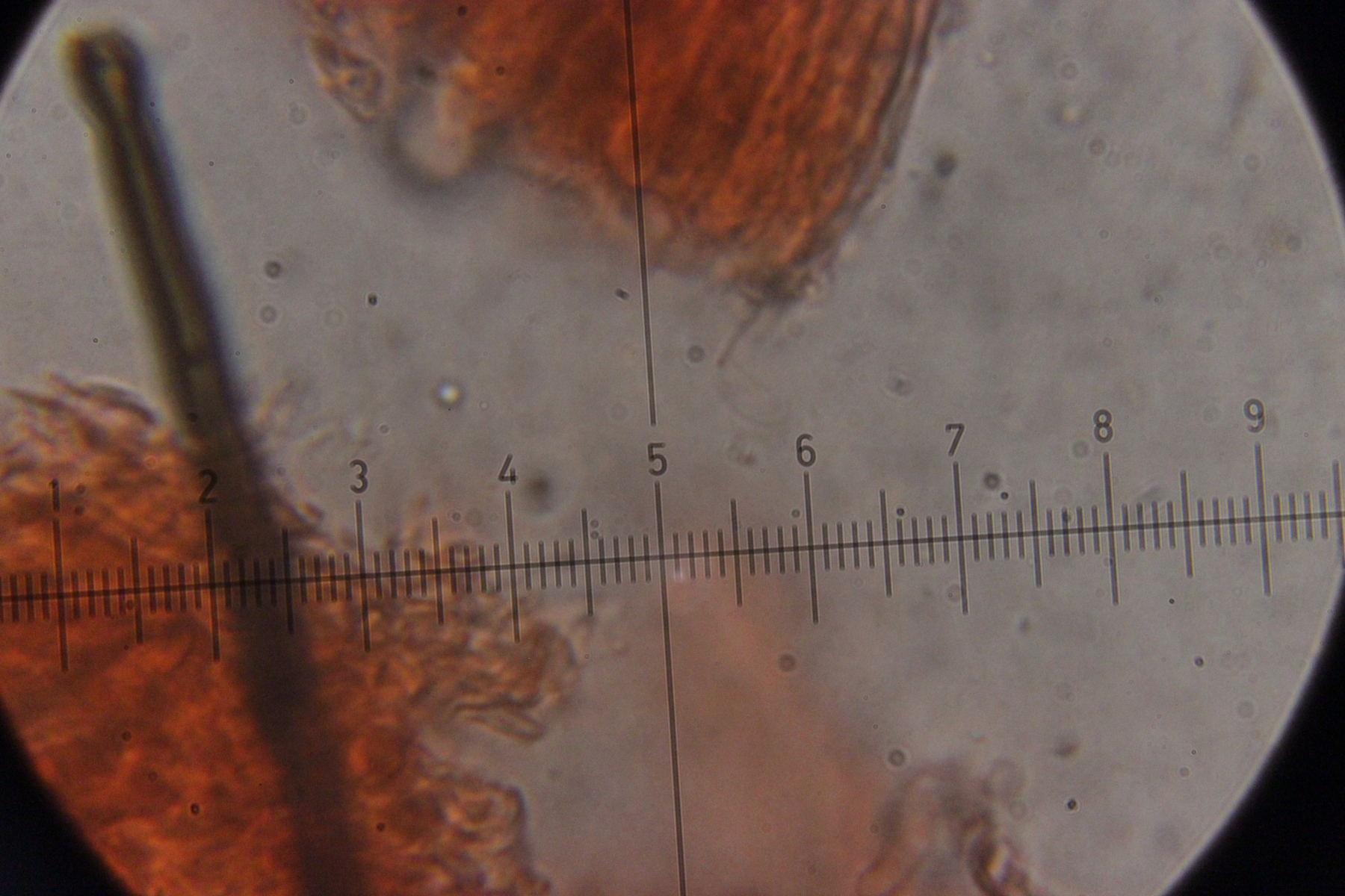 Was die Nummer 8 angeht, habe ich gerade mal die eine Spore, die auf einem meiner Fotos abgelichtet ist, ausgemessen und komme auf 5.5 µm x 2.3 µm also deutlich zu kleine für P. pubera. Dann hab ich den Pilz gerade auch noch mal unterm Mikro gehabt und nach Schnallen gesucht. Nach 10 Minuten Suche habe ich die dann auch endlich gefunden. Außerdem hat der Pilz ein Bad in Sulfovanillin bekommen. Gloeozystiden habe ich dabei aber keine entdecken können.