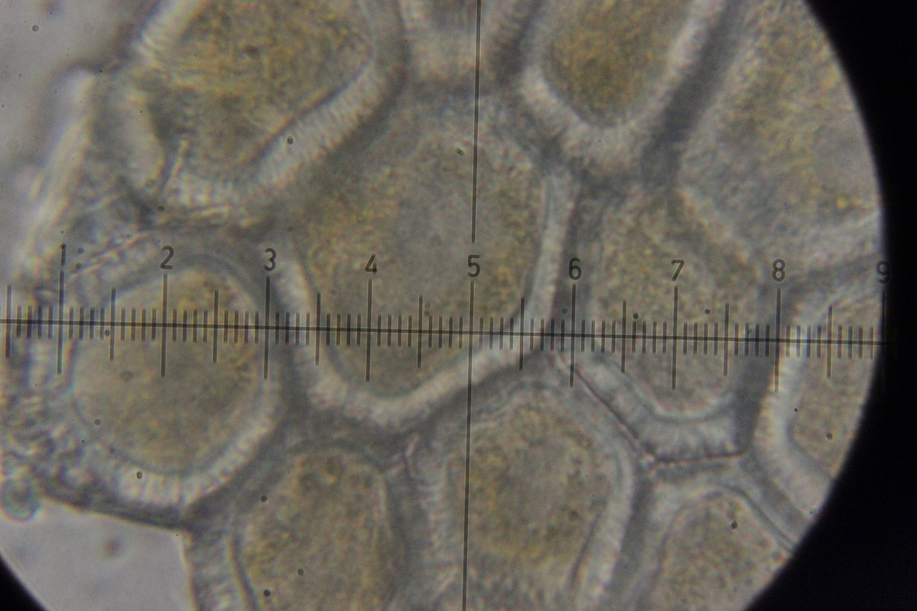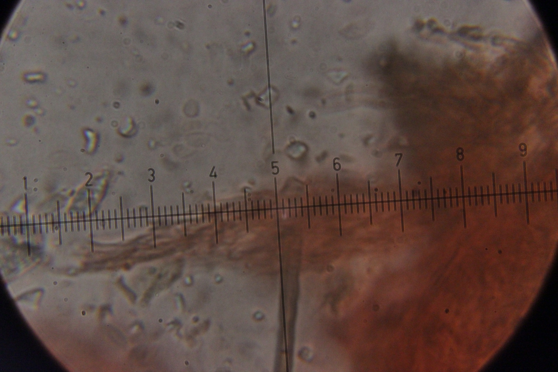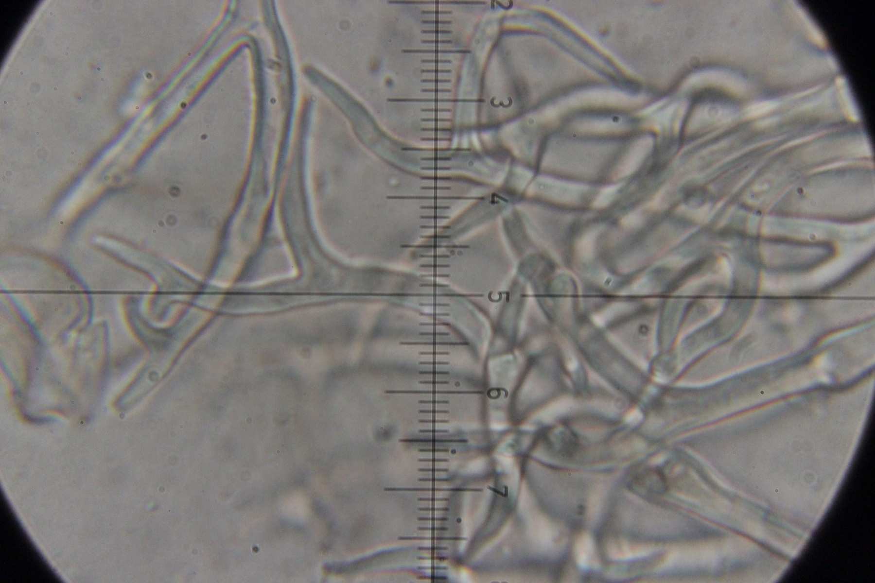 Was die Nummer 8 angeht, habe ich gerade mal die eine Spore, die auf einem meiner Fotos abgelichtet ist, ausgemessen und komme auf 5.5 µm x 2.3 µm also deutlich zu kleine für P. pubera. Dann hab ich den Pilz gerade auch noch mal unterm Mikro gehabt und nach Schnallen gesucht. Nach 10 Minuten Suche habe ich die dann auch endlich gefunden. Außerdem hat der Pilz ein Bad in Sulfovanillin bekommen. Gloeozystiden habe ich dabei aber keine entdecken können.