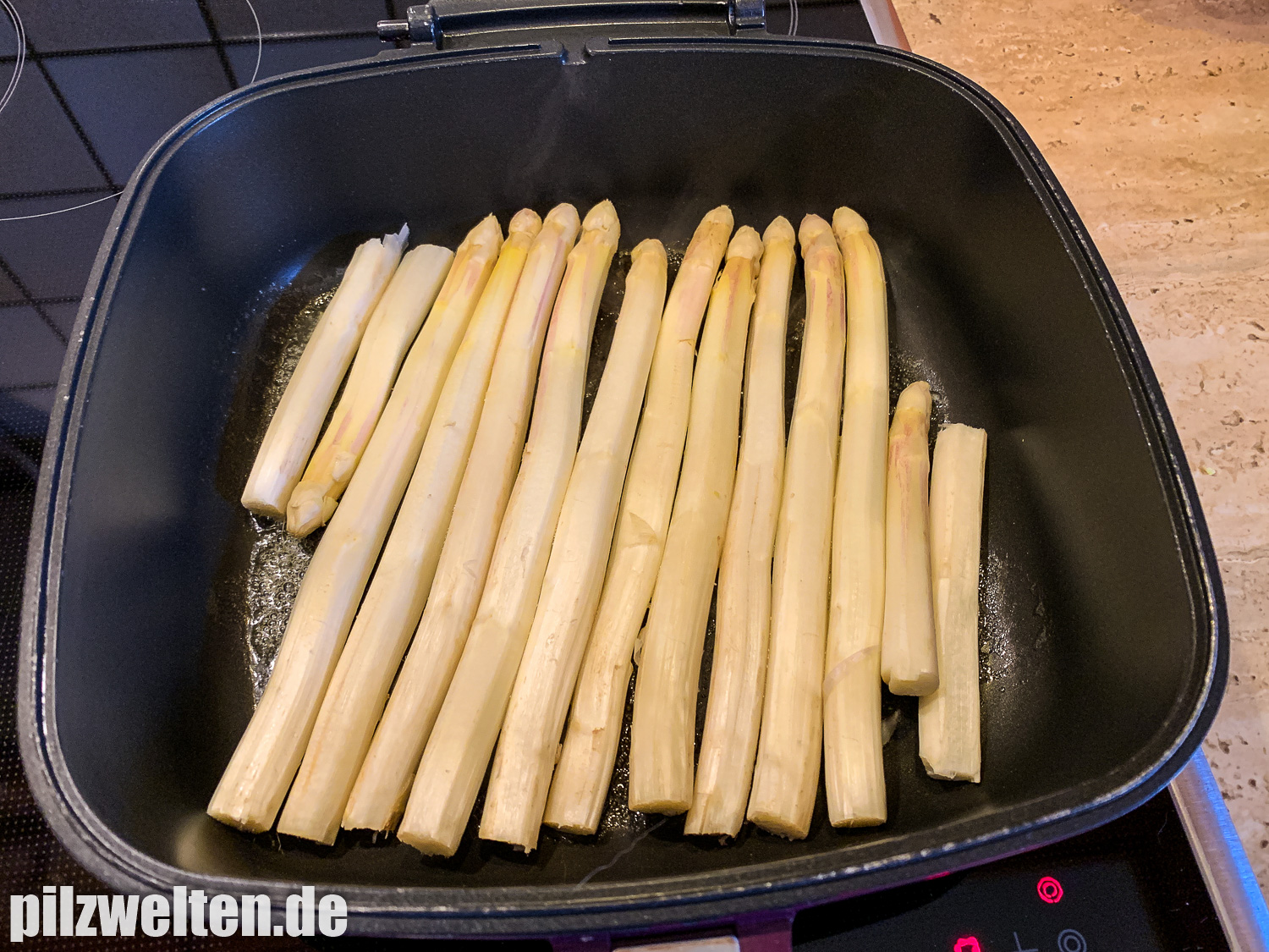 - Im Anschluss den Spargel in die Pfanne legen und ganz wichtig: Deckel zu, damit die Flüssigkeit im Topf bleibt.