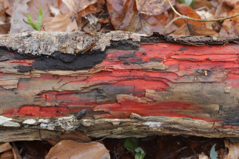 11. Dieses auffällig rot gefärbte Holz fand sich unter der Rinde von Birke. Mario meinte sich zu erinnern, daß so etwas schon mal bei einer APR-Exkursion gefunden wurde, pizlichen Ursprungs ist und mit irgendwelchen Becherchen in Verbindung steht. Weiß jemand mehr?