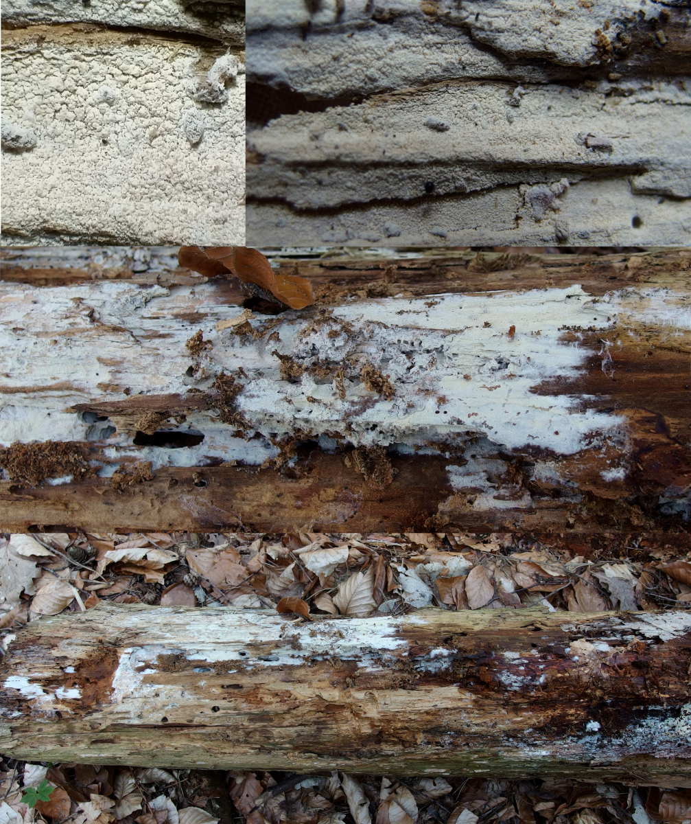 Wenn meine Einschätzung stimmt, wäre Coniophora puteana s.l. schon noch ein deutlich dickeres Gedöns, mit krustiger und frisch wachsartiger Oberfläche, normalerweise deutlich warzig und dann haptisch eher wie eine Phlebia oder so. Trocknend wird sie dann rissig, hart, die Warzen aber oft noch erkennbar. Coniophora arida s.l. sollte eher eine filzige bis ledrig - häutige Oberfläche haben, weitestgehend glatt (also ohne deutliche Warzen). Aber auch das könntebei beiden wieder variabel sein, erst recht, wenn es sich eigentlich um mehr als zwei Arten handelt.