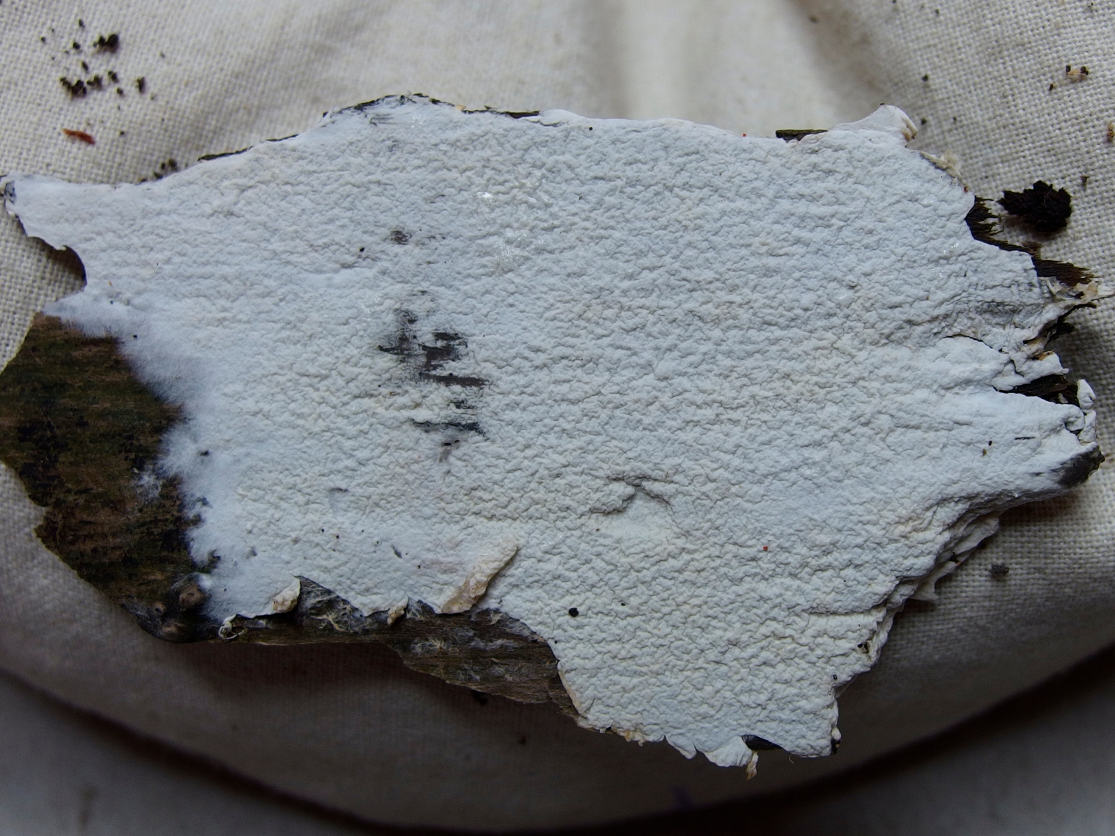 Der Pilz sieht Optisch aus als wäre aus Sondkörner gebildet, es lässt sich auch leicht abkratzen und darunter kommen diese Weiße Hyphen/Rizomorphen zum vorschein.