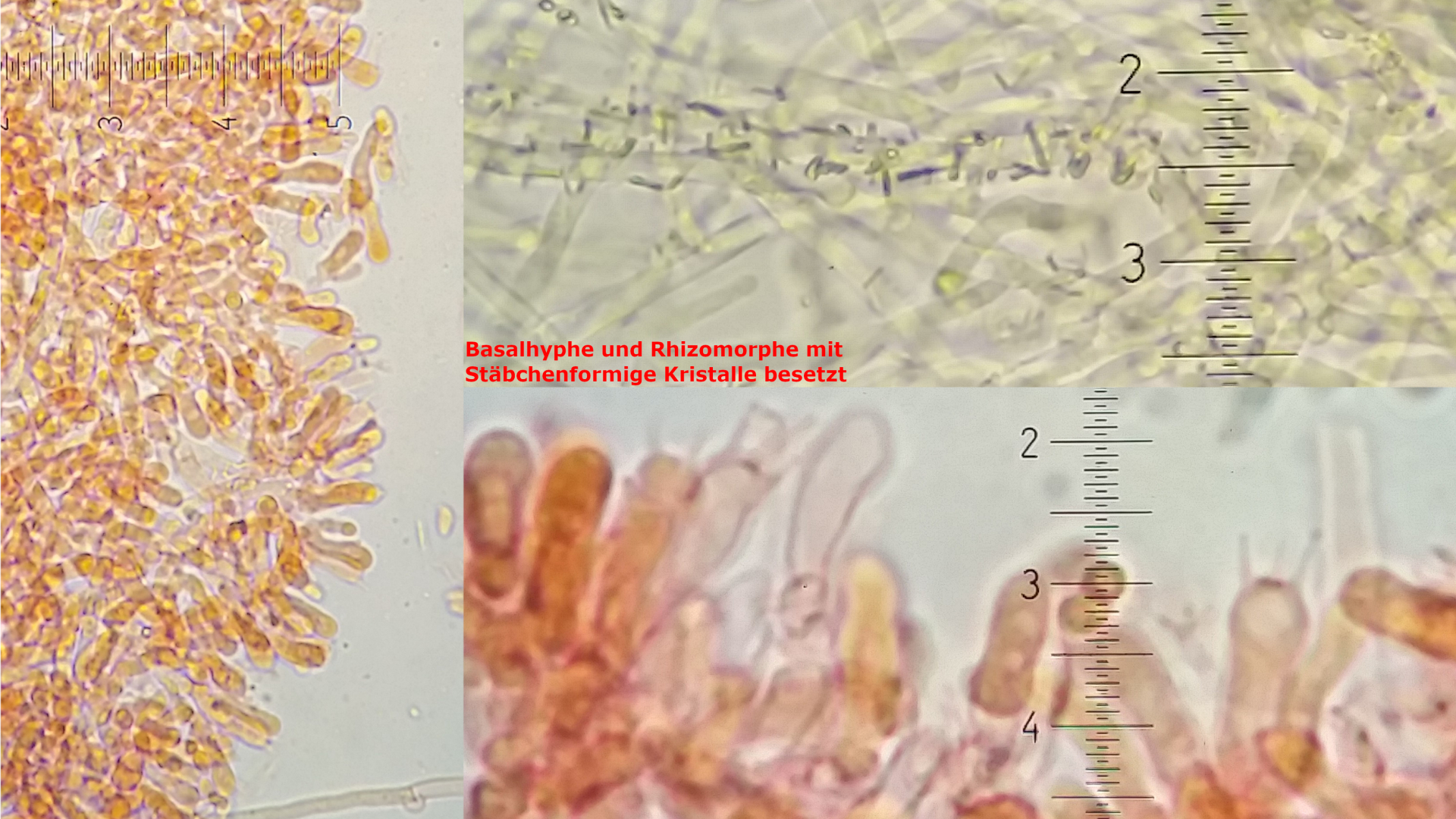 Oben links und unten links die typischen Halozystiden ähnlichen Hyphenenden, die Basidien sind klein und kurz und sehen aus wie kleine Fässer, sehr schwierig zu finden waren die dünne, spitzanlaufenden Basidiolen (Oben rechts).