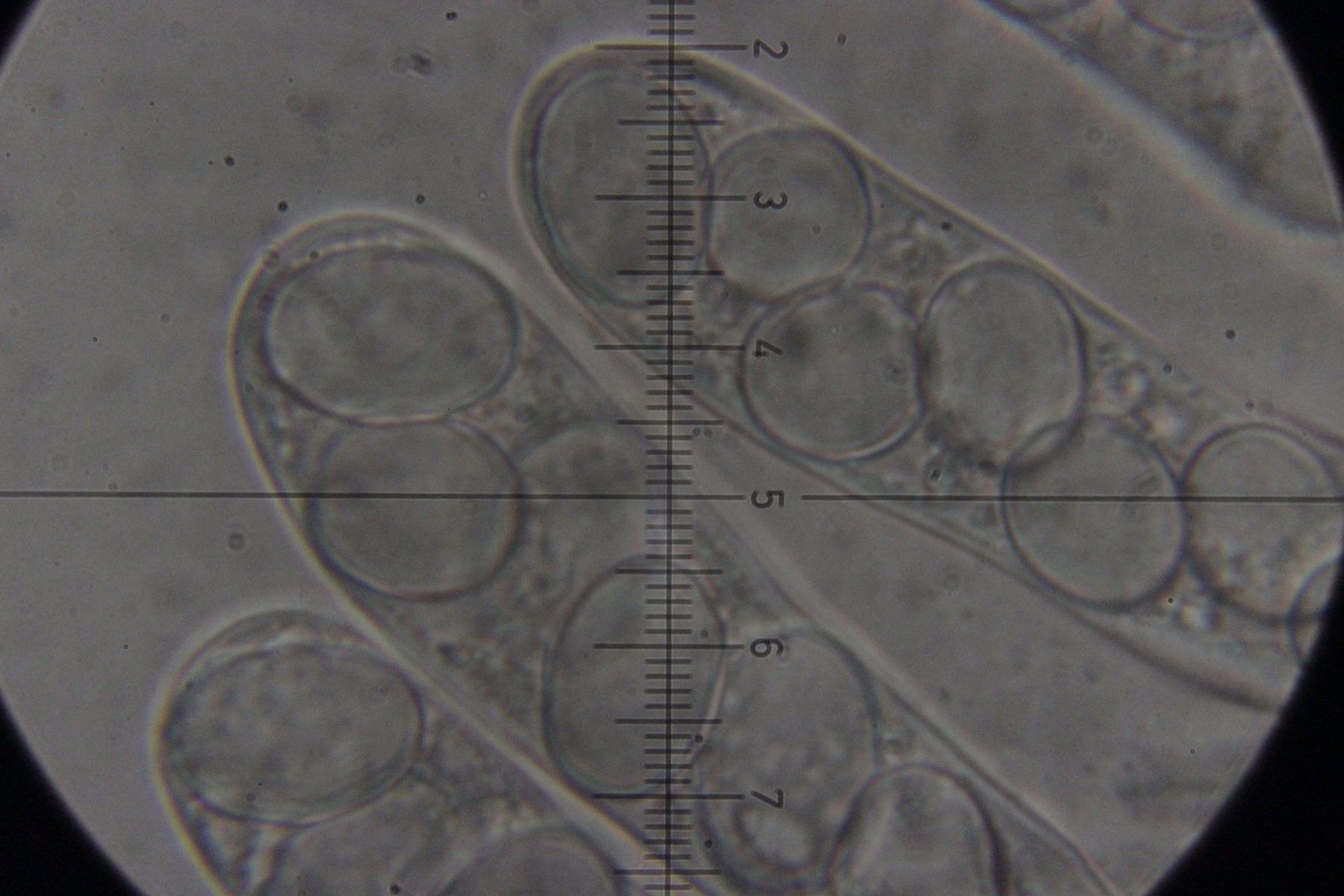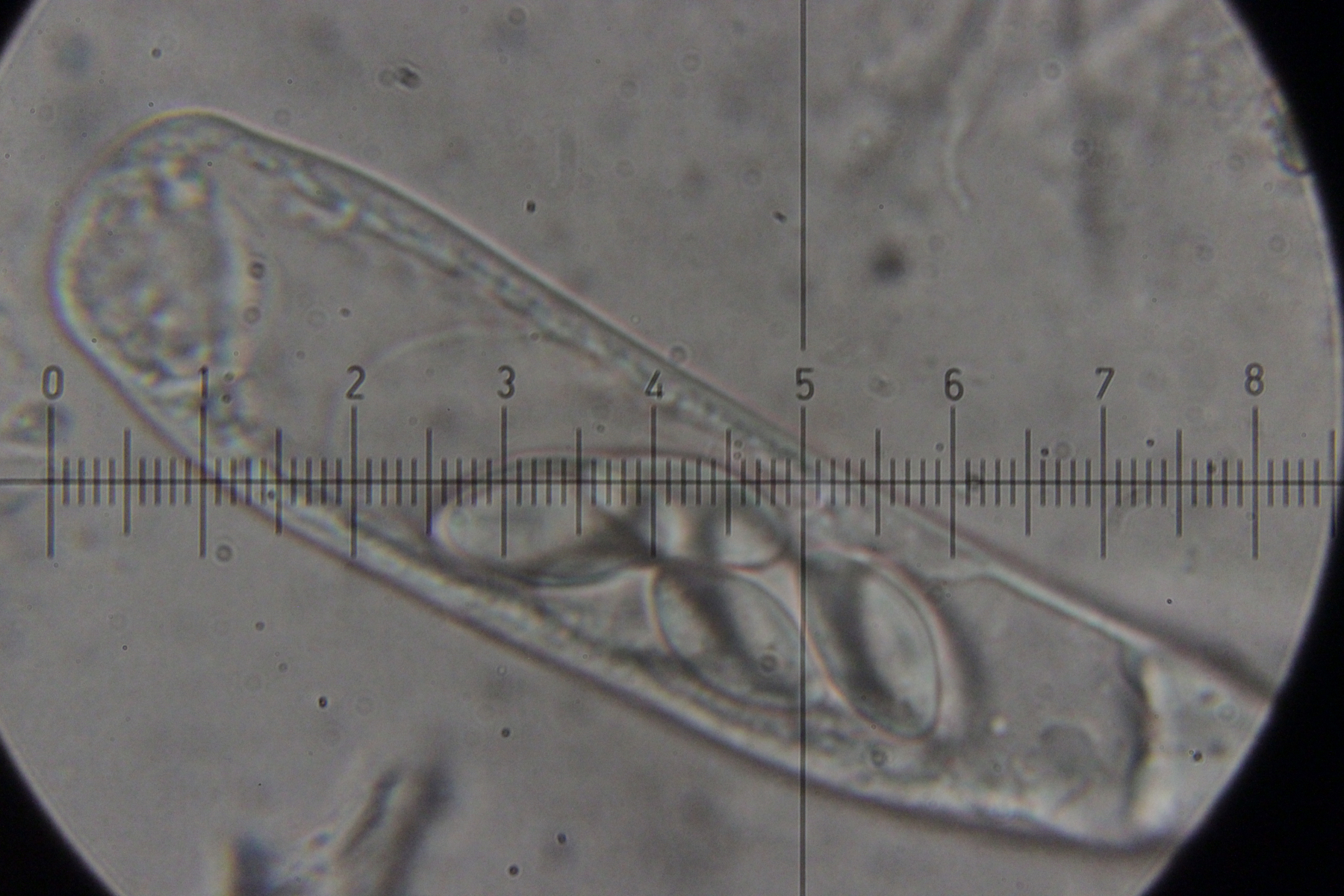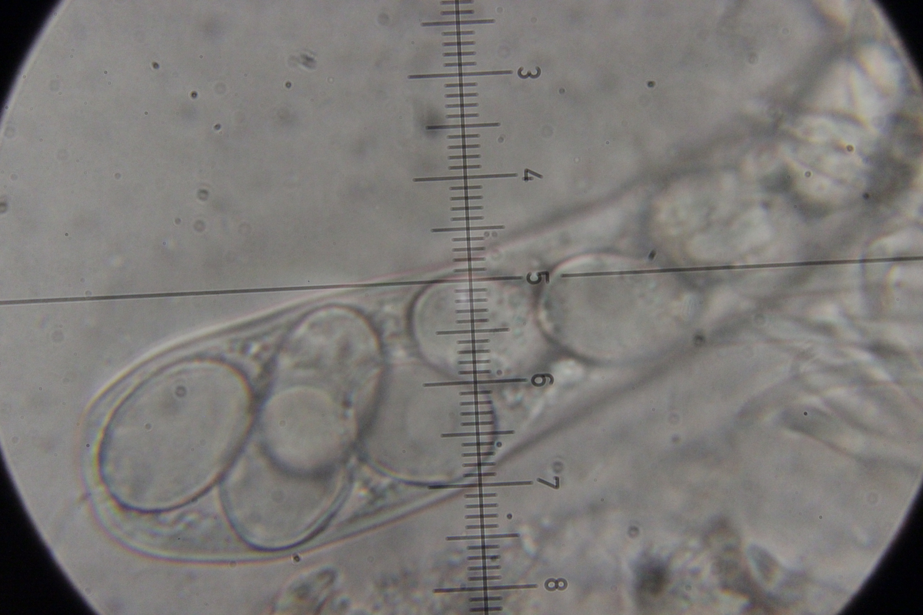 Asci sieht man nur selten, da die Art nur einen hat und dieser beim Präparieren oft zerquetscht wird.