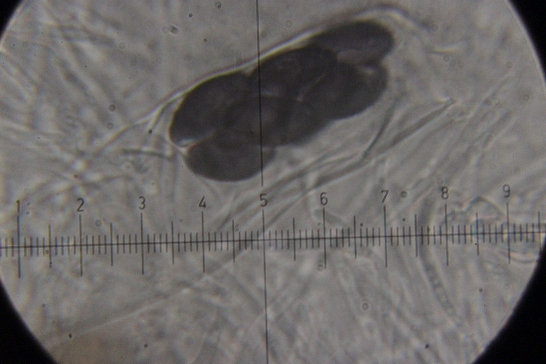 Der erste Fund könnte in Richtung T. d. gehen. Die Setae färben mit Lugol ganz leicht gelb-orange. Reicht das schon? Außerdem waren bei einem Haar zwei Septen erkennbar. Sporengröße ist (16.3+-0.5) µm x (11.5+-0.3) µm.