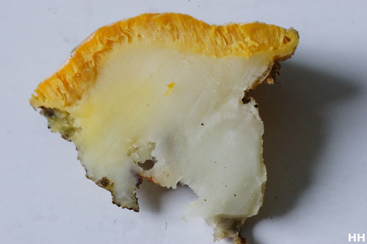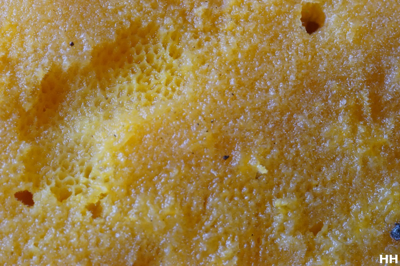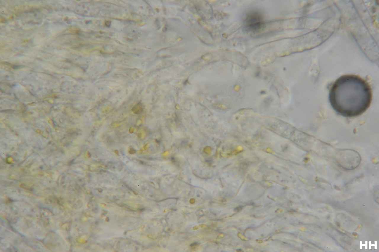 Die Sporen (9.) könnten zu Oligoporus luteocaesius passen, die fehlende bläuliche Färbung und das Substrat nicht; (Parasit ungeklärt)
