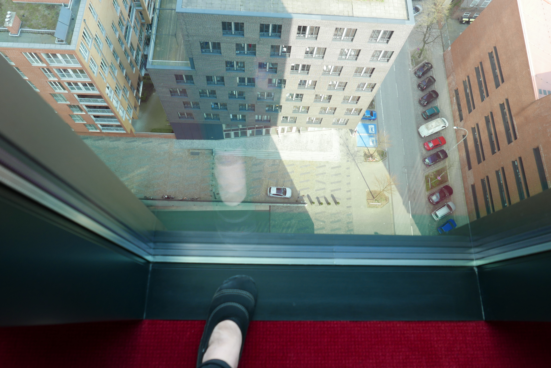 Wow, 19. Stock... Felnster bis zum Boden: und das mir! Aber ich habs recht gelassen genommen, der Ausblick war einfach zu toll! Unten stehen die winzigen Autos