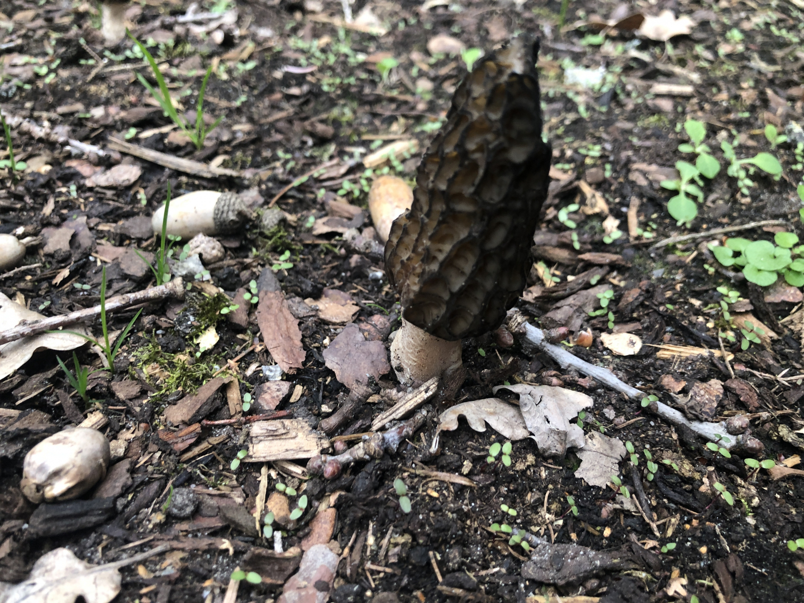 weil da Eichenblätter und Eicheln rumliegen. Aber womöglich leben die Morcheln hier von Häckselgut und nennen sich RiMuMo. Wobei das Gehäcksel nicht besonders neu aussieht, und die RiMuMos kommen meist schon im Jahr nach der Ausbringung des Mulches. Im Jahr danach nur noch ausnahmsweise und vereinzelt. Dann gar nicht mehr. Dann käme wieder Detritus der Eiche ins Spiel... Und ich habe die Spitzigen noch nie unter Eiche gefunden (was aber nix heissen muss)