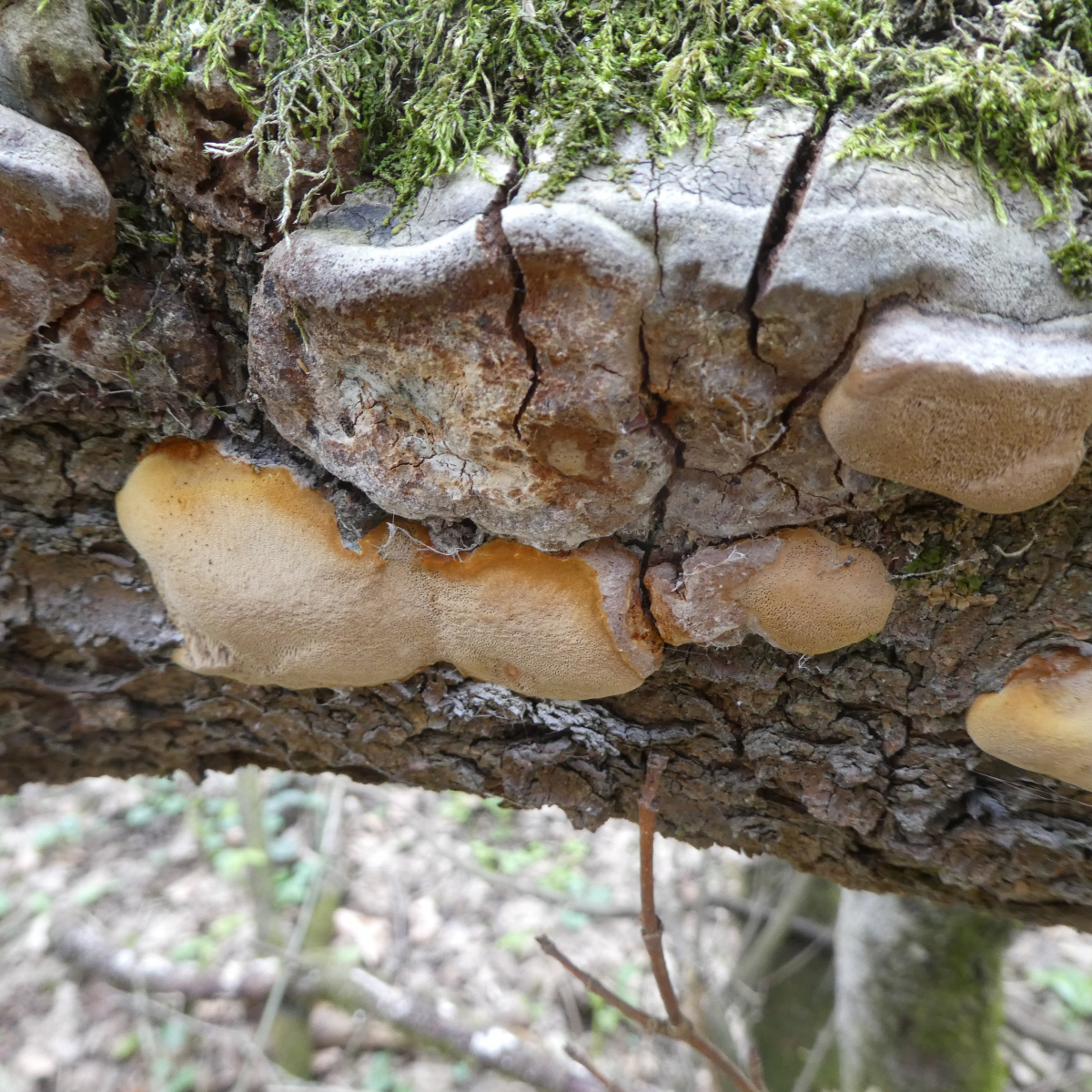 gestern fand ich im Altmühltal am Waldrand an mehreren abgestorbenen Gehölzen diese Pilze. Leider weiß ich nicht welche Bäume dies waren, Sanddorn allerdings nicht. Könnten dies wegen dem eigenartigen Gespinst trotzdem Sanddornfeuerschwämme sein?