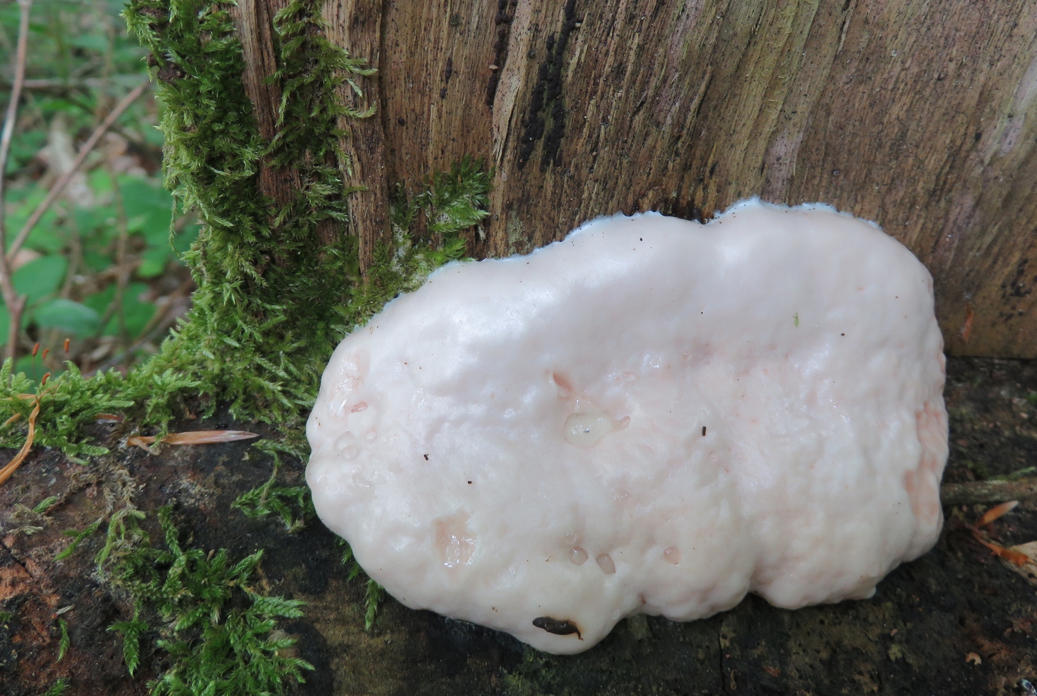6) Ein Stäublingsschleimpilz oder doch was anderes? Konsistenz wie Pudding. Farbe: weiss mit einem Hauch von rosa, auch innen (siehe Schnittbild).