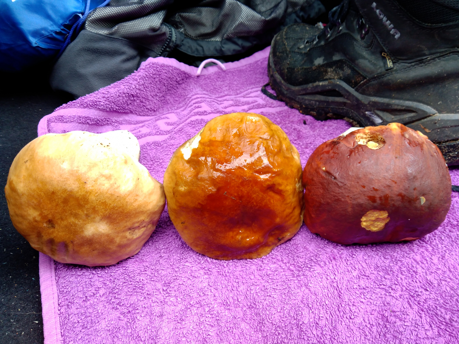 Hier von links nach rechts die Boleten-Parade: Sommersteinpilz (B. reticulatus), "echter" Steinpilz (B. edulis), Kiefern-Steinpilz (B. pinophilus):
