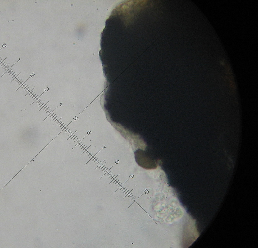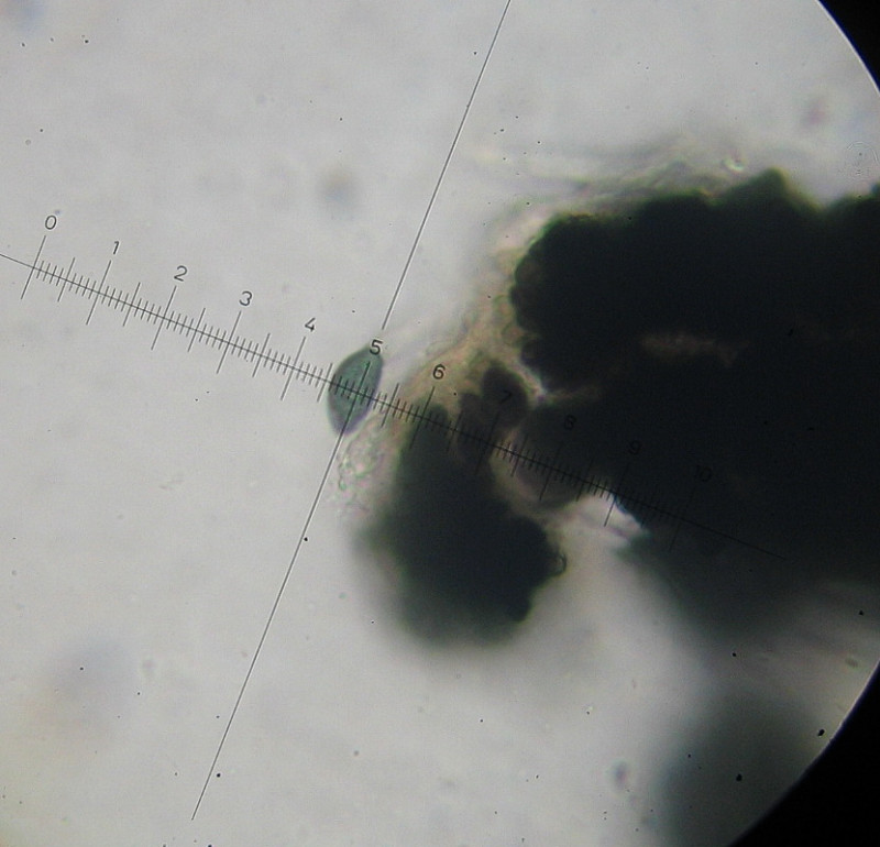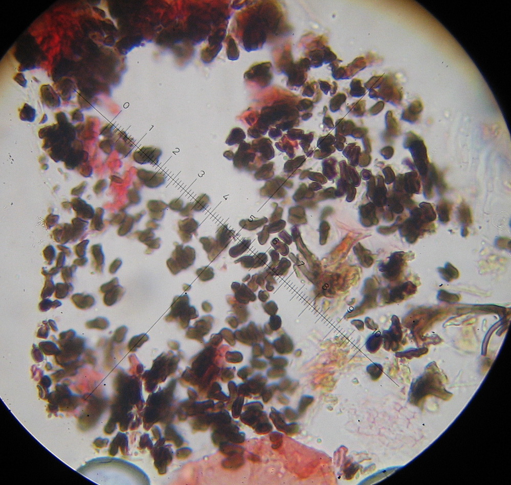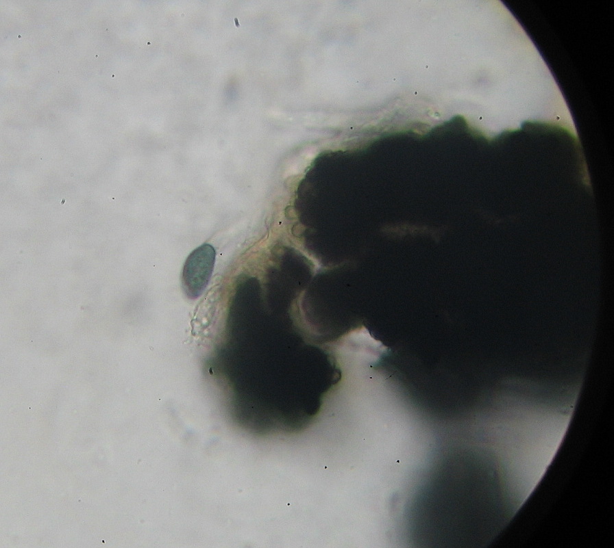 Fast reif: Sporenkopf graubraun,ellipsoid-zitronenförmig12 x7µ und ca 20 x 5µ langen hyalinen "Schwanz"