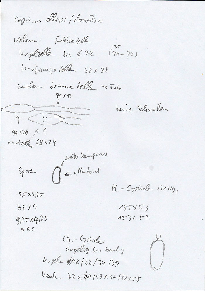 Hier noch meine Mikronotizen (ohne die ausführlichere Sporenmessung) - alle Maße mal 0,95 nehmen bzw. 5% abziehen. Mein Messokular ist nicht 1:1 übersetzend. Und sorry für die Sauklaue - ich kann's lesen *hihi