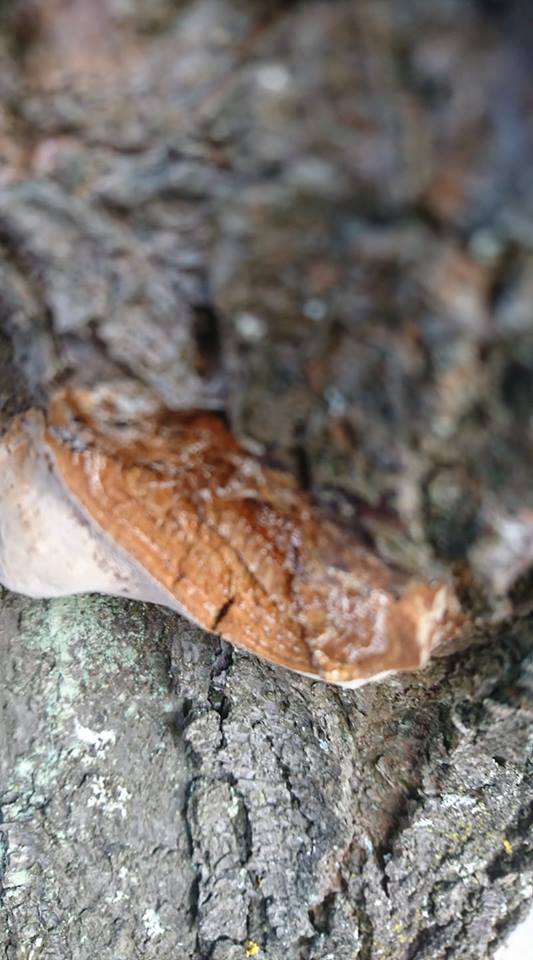 Teils unscharfe Fotos, keine Baumart bekannt, Pilz in Scheiben... dann einmal eine zu erahnende orangfarbige Hutoberseite, sonst wie ein Pflaumenfeuerschwamm aussehend?!