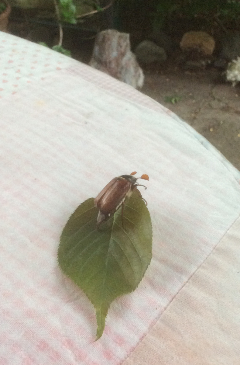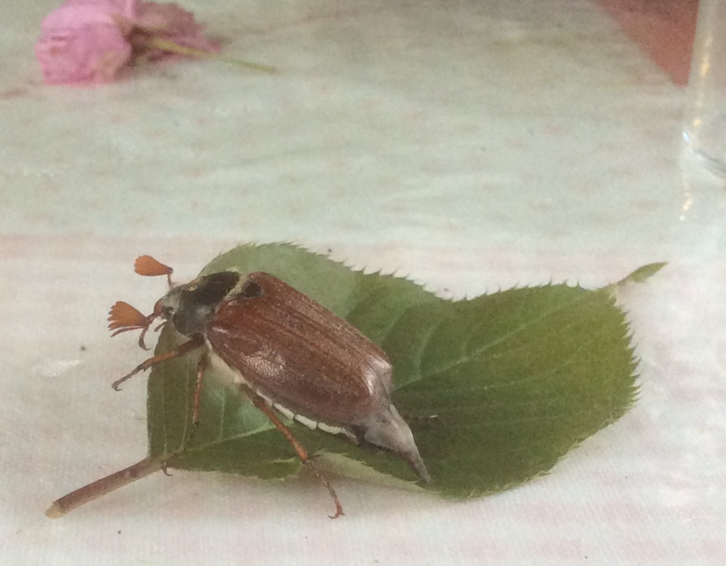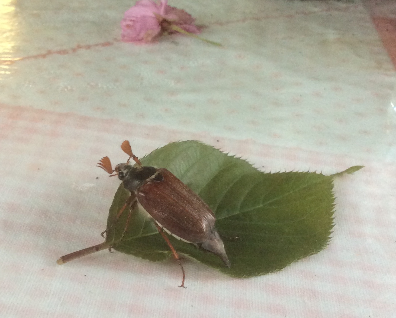 Ein Maikäfer lag still und steif dort auf dem Rücken, und wir dachten schon, er sei tot...aber nach ein paar Minuten in meiner Hand kam Leben in das Krabbeltierchen, und nach einer kleinen Fotosession auf dem Terrassentisch konnte er seiner Wege fliegen...
