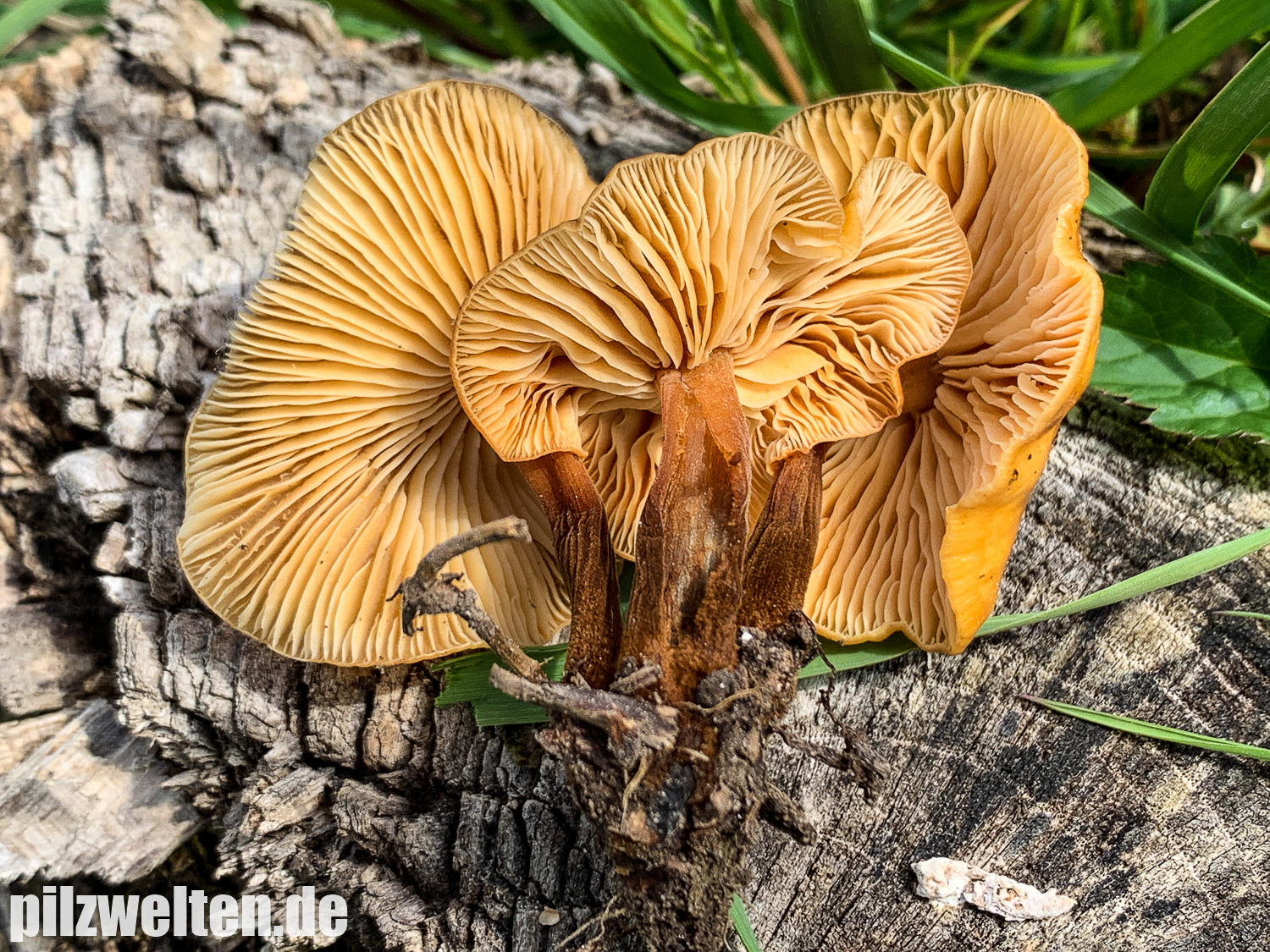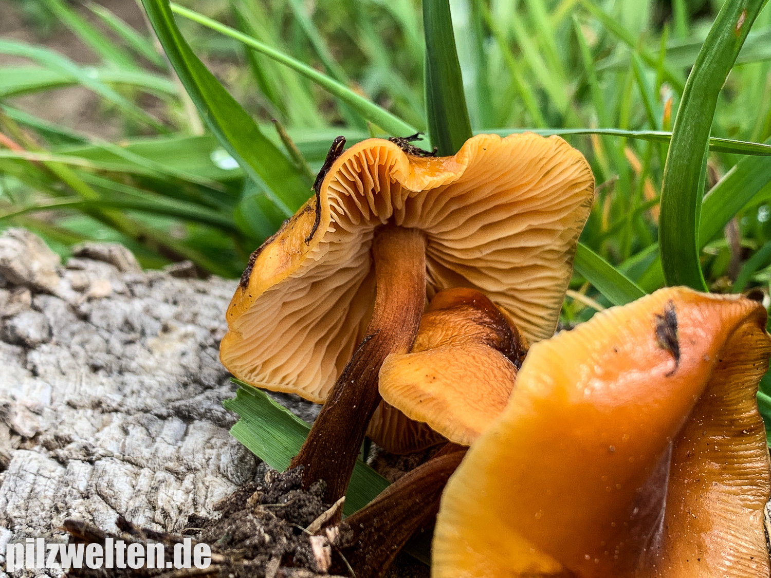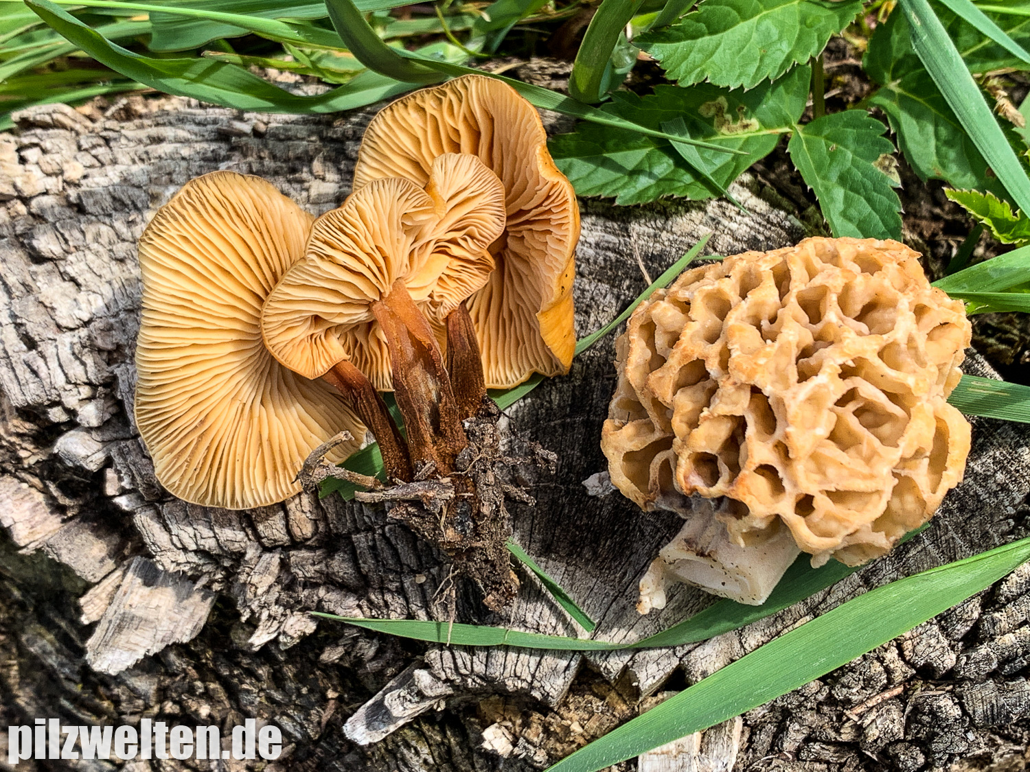 direkt an einem Speisemorchel-Hotspot wuchsen auch die folgenden Exemplare, die wir nur als Samtfußrüblinge bestimmen konnten. Hätten wir jetzt November / Dezember / Januar / Februar oder vielleicht noch März, dann würden wir das auch bei Samtfußrübling beruhen lassen, aber wir haben mittlerweile ja fast Mai und Frost gab es (zum Glück) auch keinen.